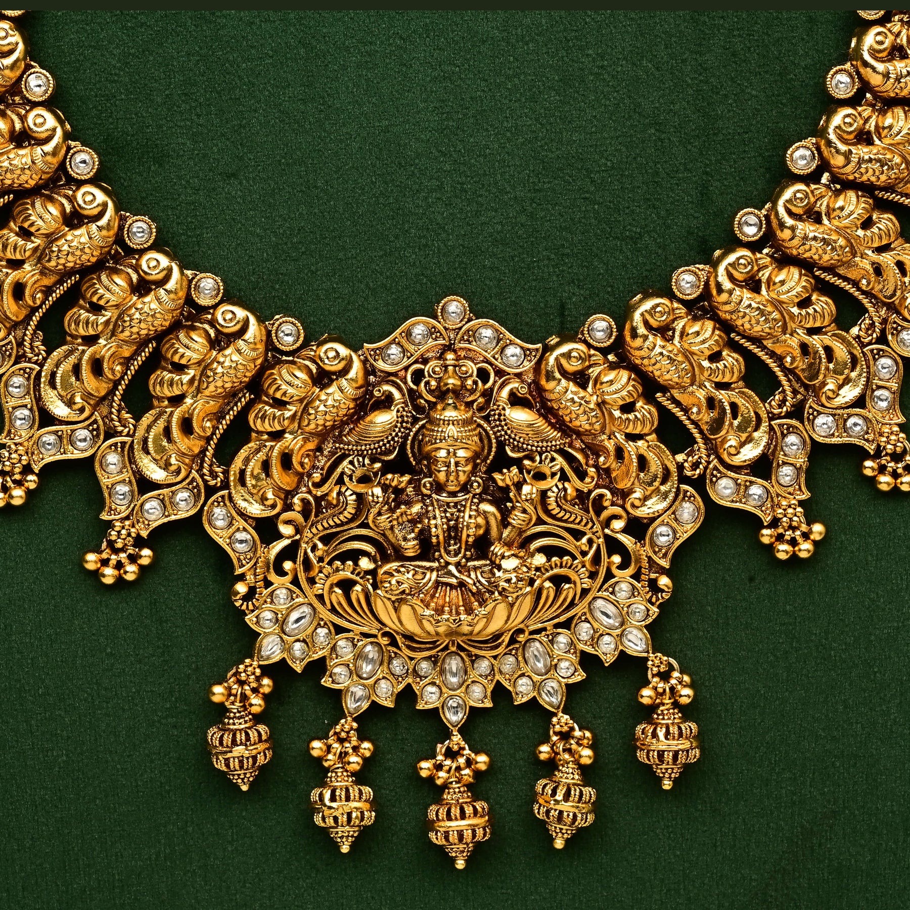 Experience the timeless elegance of this Temple Necklace Set, expertly crafted to capture the divine beauty of goddess Lakshmi. Featuring a traditional design with an authentic gold finish, it offers the rich appearance of real gold while ensuring lasting charm. This one-of-a-kind piece celebrates heritage and artistry, making it a distinguished addition to any jewelry collection. Perfect for special occasions that call for a touch of cultural sophistication.