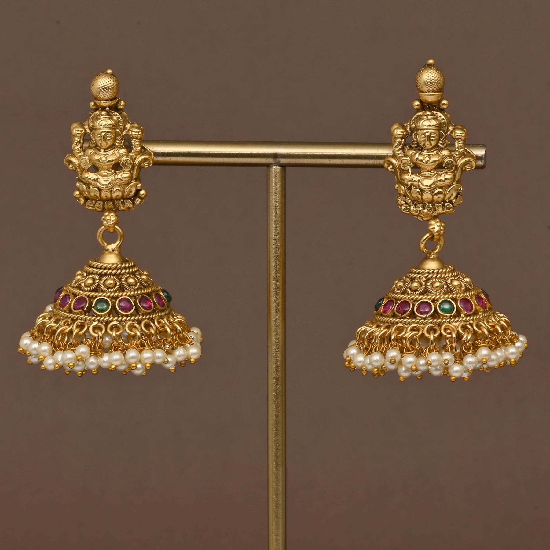 This exquisite Temple Necklace Set, crafted in a rich gold finish, beautifully captures the divine essence of Goddess Lakshmi. Designed to emulate the appearance of real gold, it showcases a one-of-a-kind traditional pattern that reflects authentic temple jewelry artistry. Perfect for special occasions, this set blends cultural heritage with elegant craftsmanship, adding a timeless charm to your collection.
