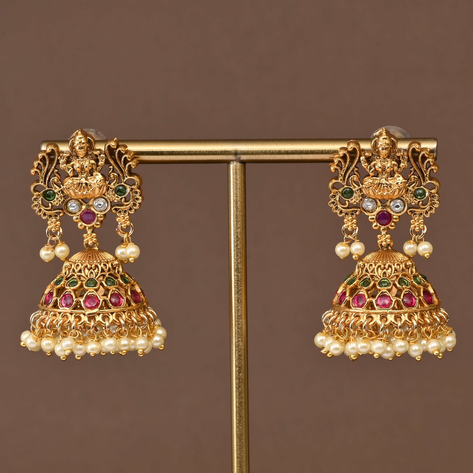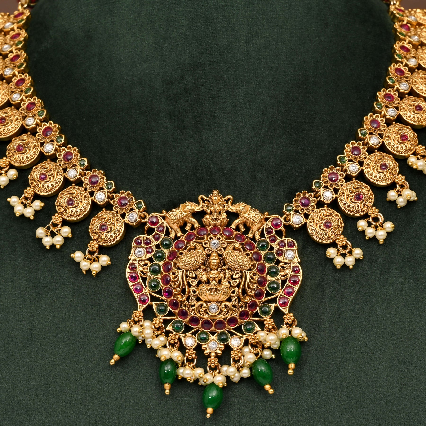 This Temple Necklace Set features a distinctive traditional design inspired by goddess Lakshmi, crafted to emulate the rich appearance of real gold. Its intricate gold-finish detailing makes it a one-of-a-kind piece that adds an authentic, timeless charm to any ethnic ensemble. Ideal for cultural celebrations and special occasions, this set blends heritage artistry with expert craftsmanship.
