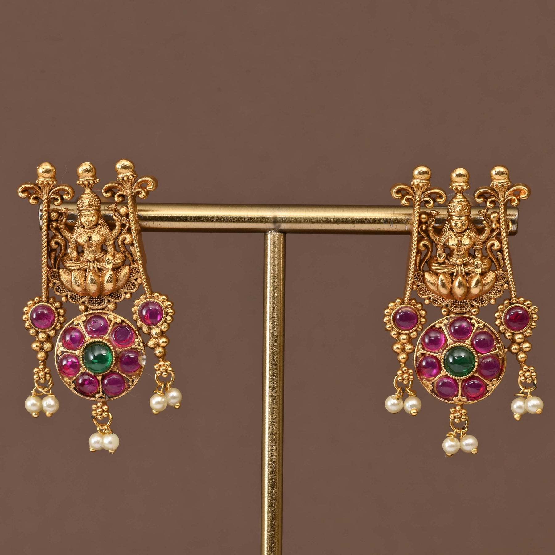 This temple necklace set features an exquisite gold finish that beautifully mimics the richness of real gold. Showcasing an intricate design inspired by goddess Lakshmi, it embodies traditional craftsmanship that is truly one of a kind. Perfect for those seeking an authentic and timeless piece, this set elevates heritage jewelry with its detailed artistry and regal presence.