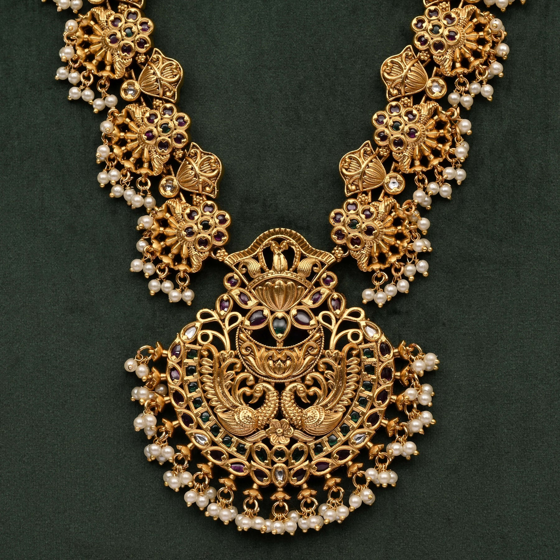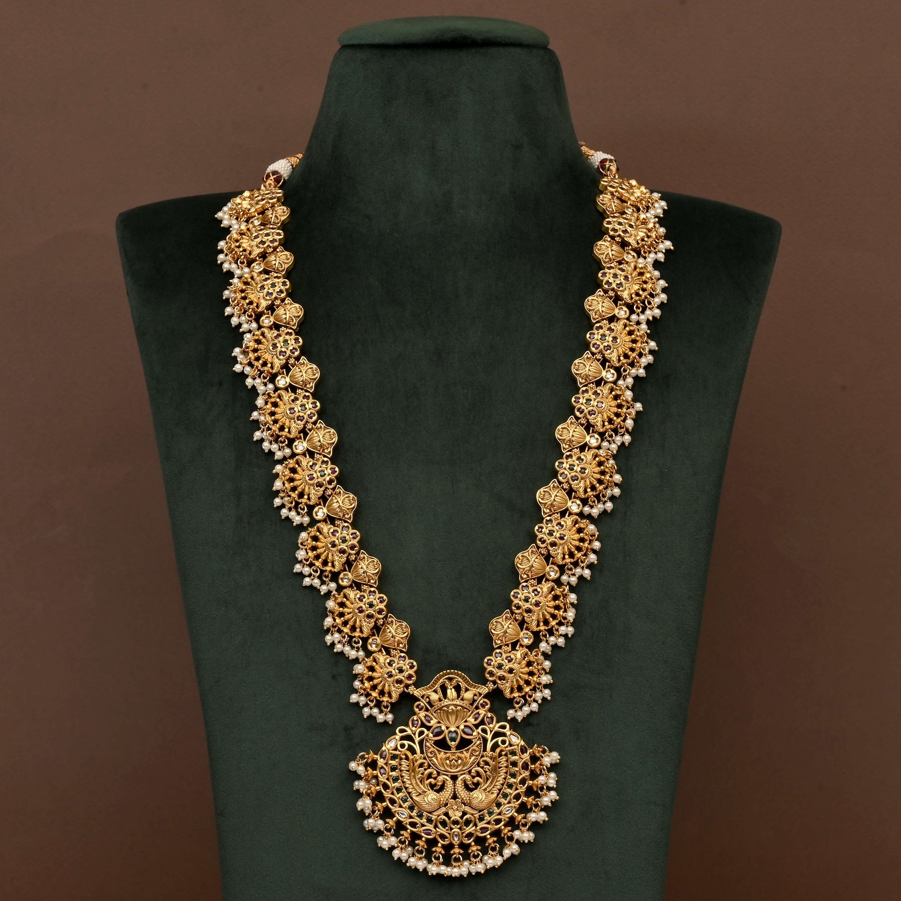 Experience timeless tradition with this handcrafted Temple Necklace Set, expertly designed to replicate the rich appearance of real gold. Each piece showcases exclusive craftsmanship that highlights intricate details emblematic of classic heritage jewelry. Perfect for those who appreciate authentic artistry and a distinguished, regal look.