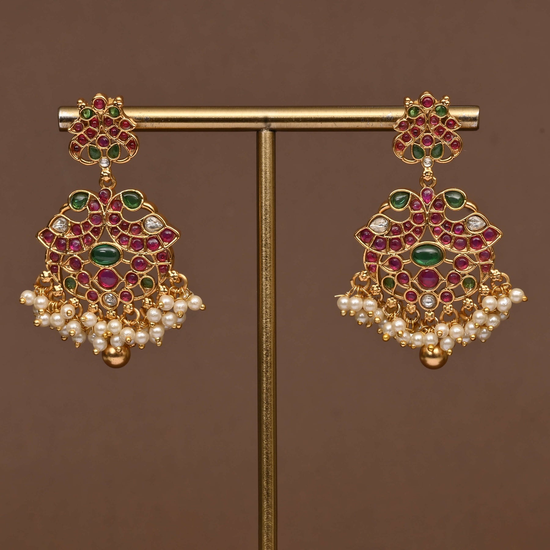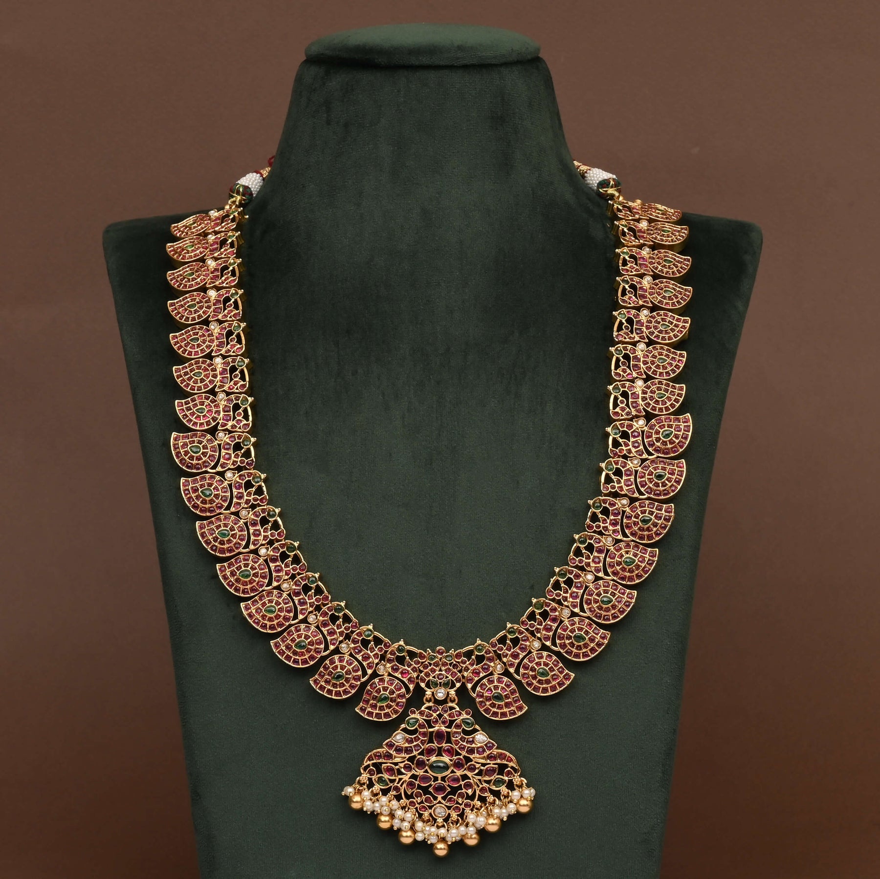 This handcrafted Temple Necklace Set features a traditional design with a rich gold finish, enhanced by semi-precious ruby stones. Its exclusive craftsmanship offers the authentic look of real gold, combining cultural heritage with refined elegance. Ideal for adding a timeless touch to your collection, this necklace set embodies both artistry and sophistication.