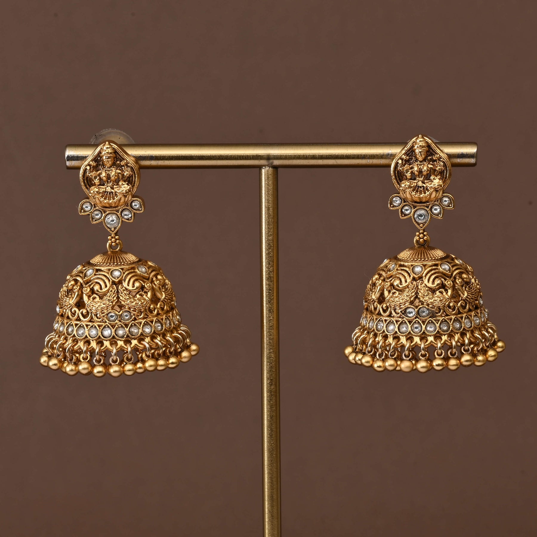 Elevate your traditional collection with this Temple Necklace Set, exquisitely crafted in a gold finish that mimics the richness of real gold. Featuring intricate designs inspired by Goddess Lakshmi and adorned with sparkling white kundan stones, this one-of-a-kind piece embodies timeless elegance and cultural heritage. Its authentic temple jewelry style makes it perfect for special occasions and ceremonial wear, offering a distinguished look that complements traditional attire with grace and sophistication.