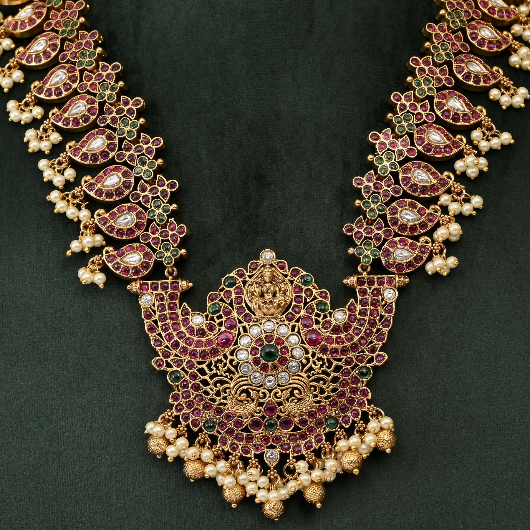 This Temple Necklace Set features a traditional nakshi-style design embellished with kundan stones, delivering an authentic temple jewelry look. Finished in a rich gold tone, it mimics the appearance of real gold, making it an exquisite choice for ceremonial occasions. Its unique craftsmanship sets it apart as a one-of-a-kind statement piece that reflects cultural heritage with expert artistry.