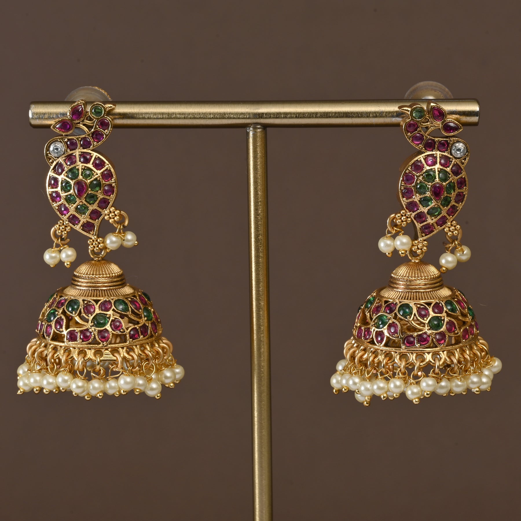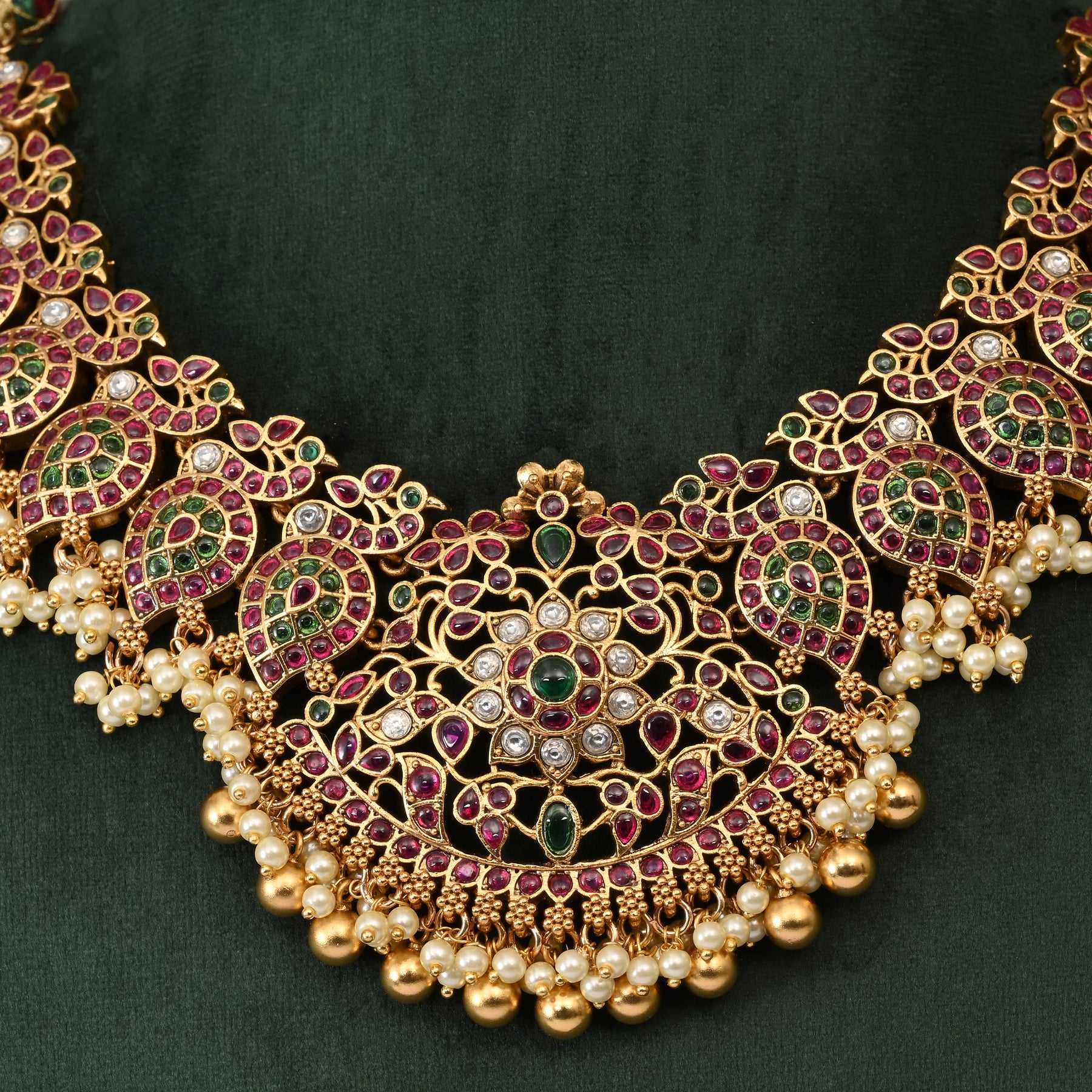 This Temple Necklace Set beautifully captures the essence of traditional nakshi design with a rich gold finish that closely mimics real gold. Its one-of-a-kind craftsmanship highlights intricate detailing synonymous with heritage jewelry, making it a sophisticated choice for those seeking authentic elegance with enduring cultural appeal. Perfect for special occasions, this set elevates any ensemble with its timeless artistry and graceful presence.