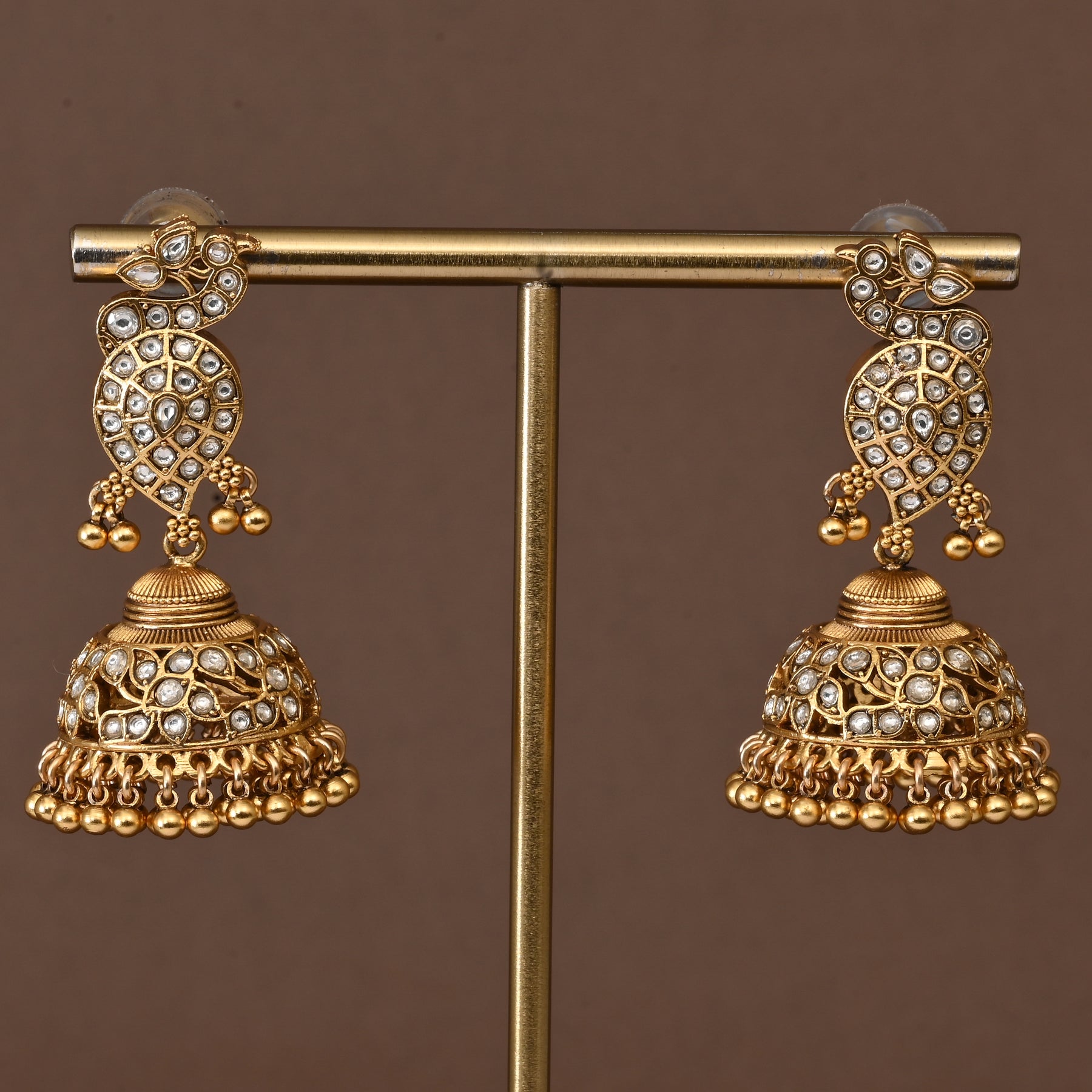 Elevate your traditional jewelry collection with this Temple Necklace Set, crafted in a rich gold finish that emulates the warmth of real gold. Featuring semi-precious white kundan stones, the necklace reflects intricate nakshi craftsmanship, presenting a one-of-a-kind design steeped in heritage. This set combines timeless elegance with expert artistry, making it a distinguished choice for cultural celebrations or special occasions.