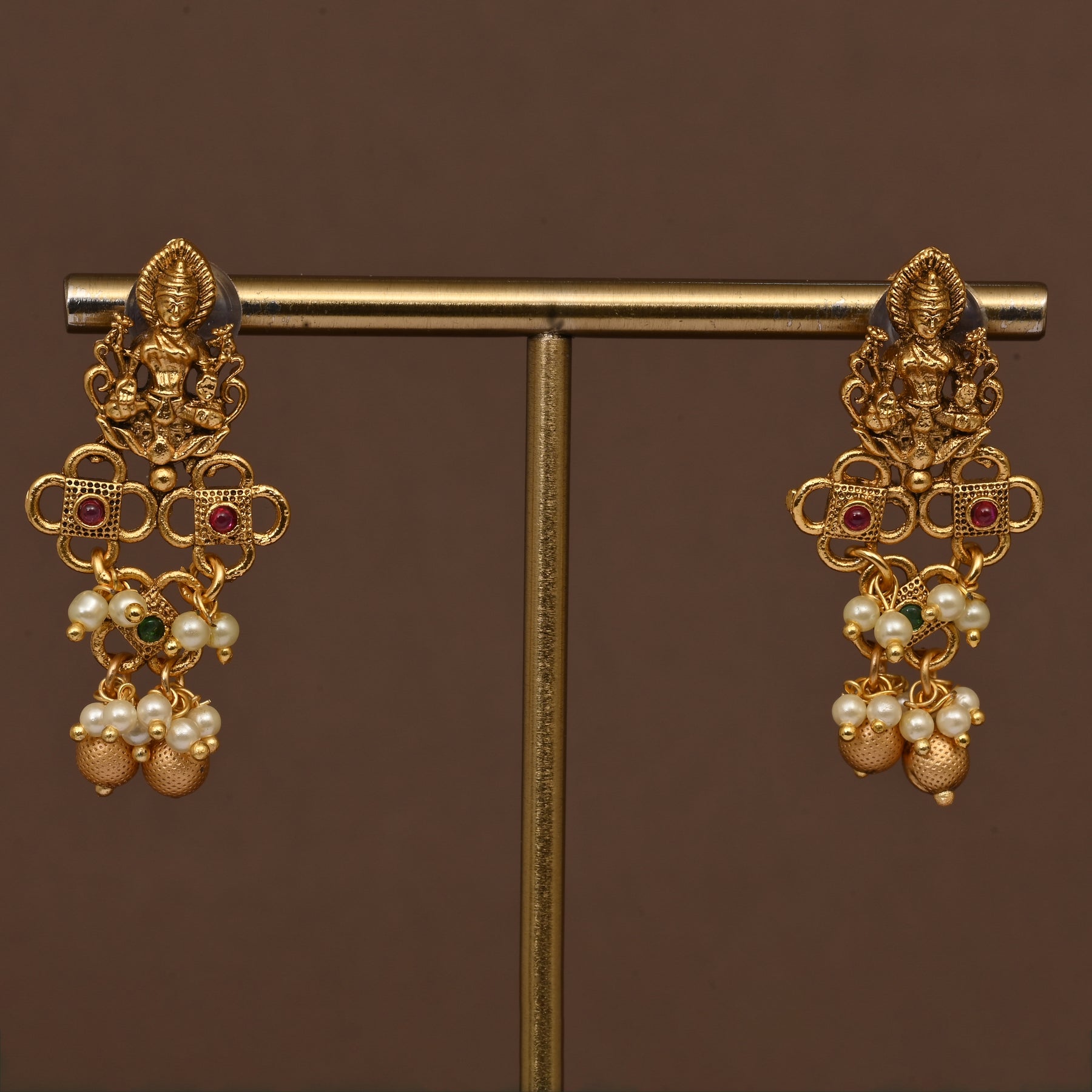 This exquisite Temple Necklace Set showcases a traditional design inspired by goddess Lakshmi, crafted in a rich gold finish that emulates the look of real gold. Adorned with lustrous white pearls, it offers a unique heritage appeal. Perfect for those seeking an authentic, one-of-a-kind piece that blends timeless craftsmanship with cultural significance.