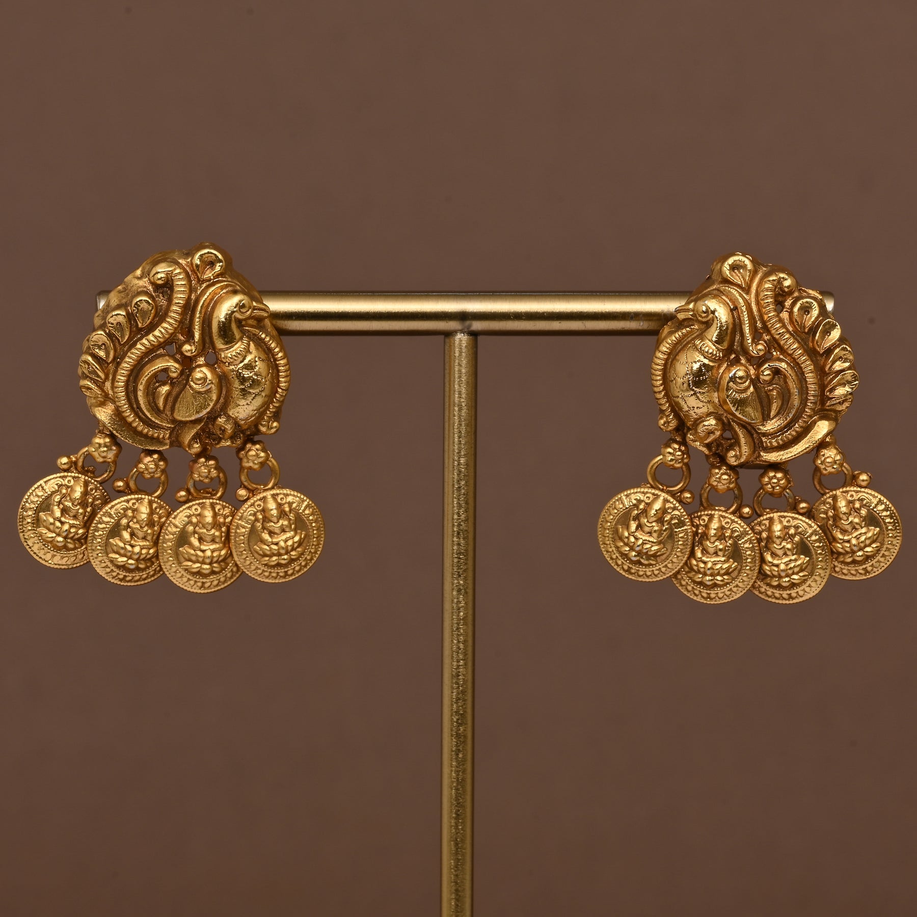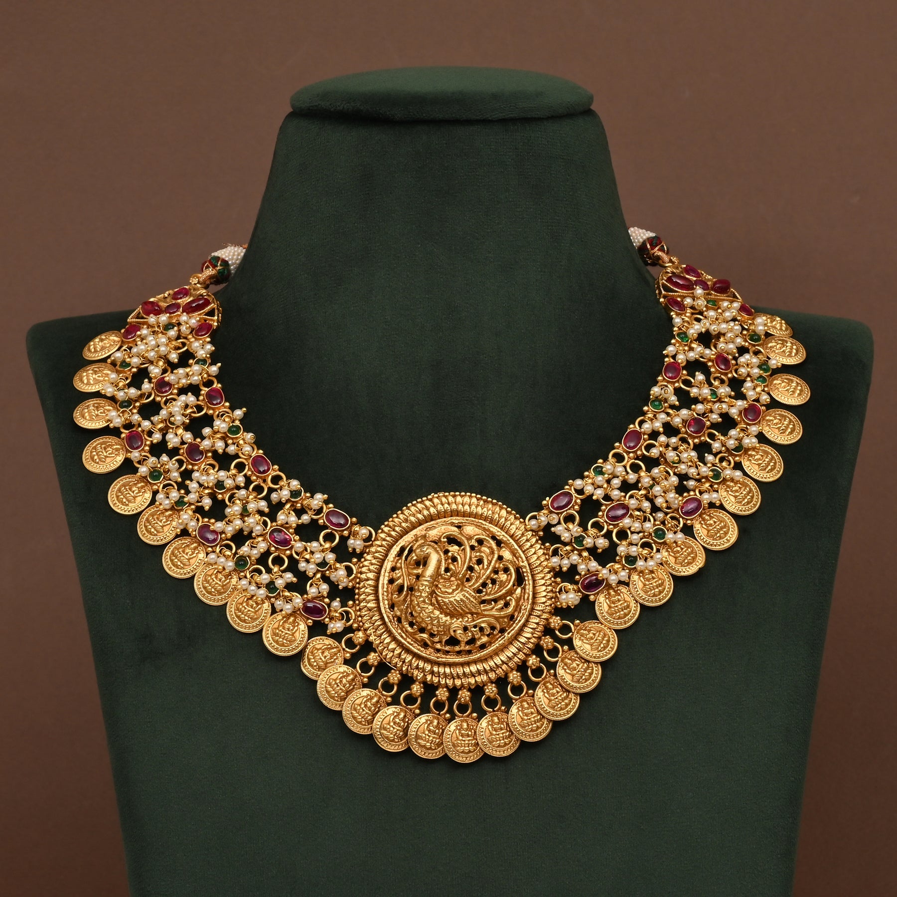 This Temple Necklace Set showcases an intricate peacock design adorned with lustrous white pearls, all finished in a rich gold tone that closely mimics real gold. Its unique traditional craftsmanship and elegant detailing make it a standout piece for cultural and festive occasions, bringing timeless sophistication and grace to your attire.