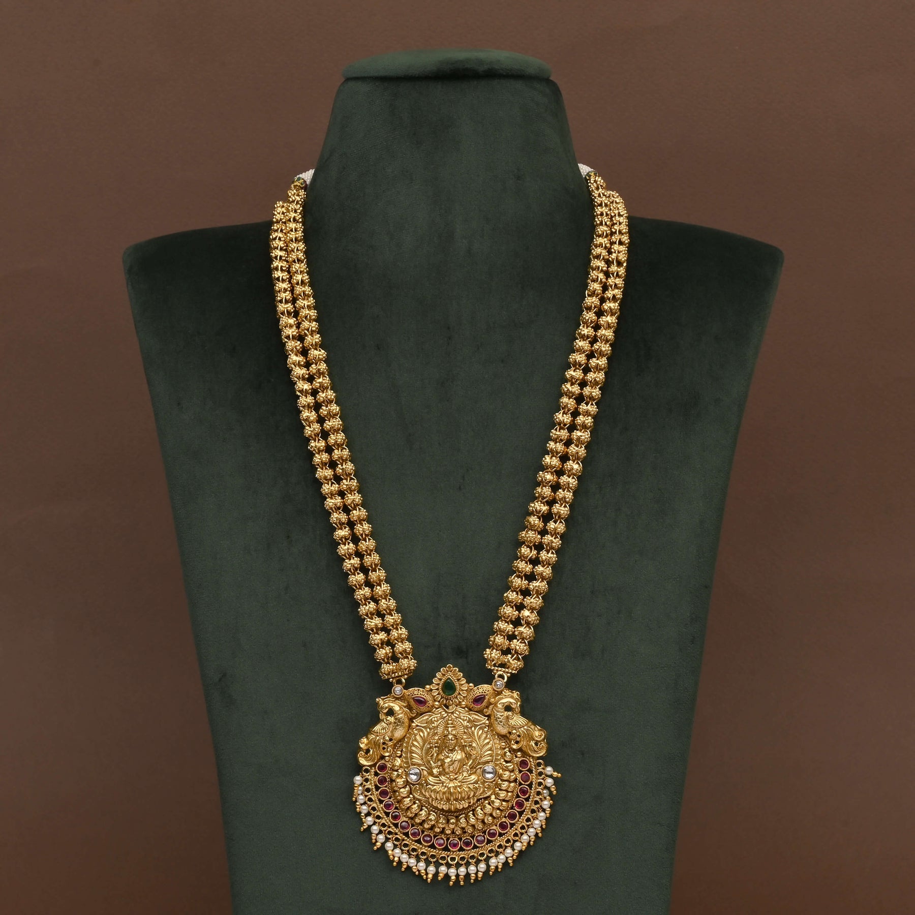 This handcrafted Temple Necklace Set features an exclusive goddess Lakshmi design in a gold finish that replicates the richness of real gold. Combining traditional artistry with meticulous craftsmanship, it offers an elegant and authentic look perfect for special occasions and cultural celebrations. The detailed work and timeless style make this necklace set a distinguished piece for any jewellery collection.