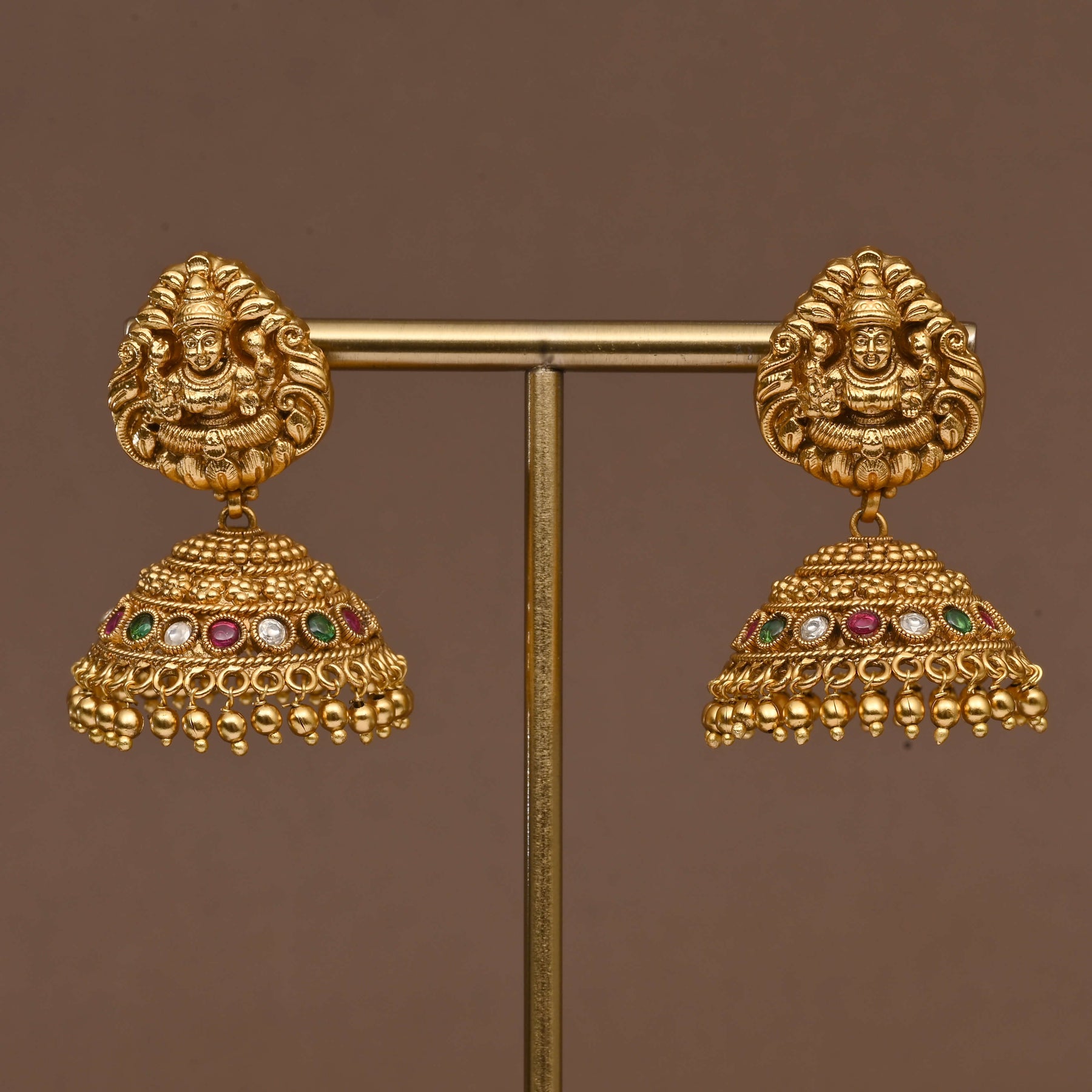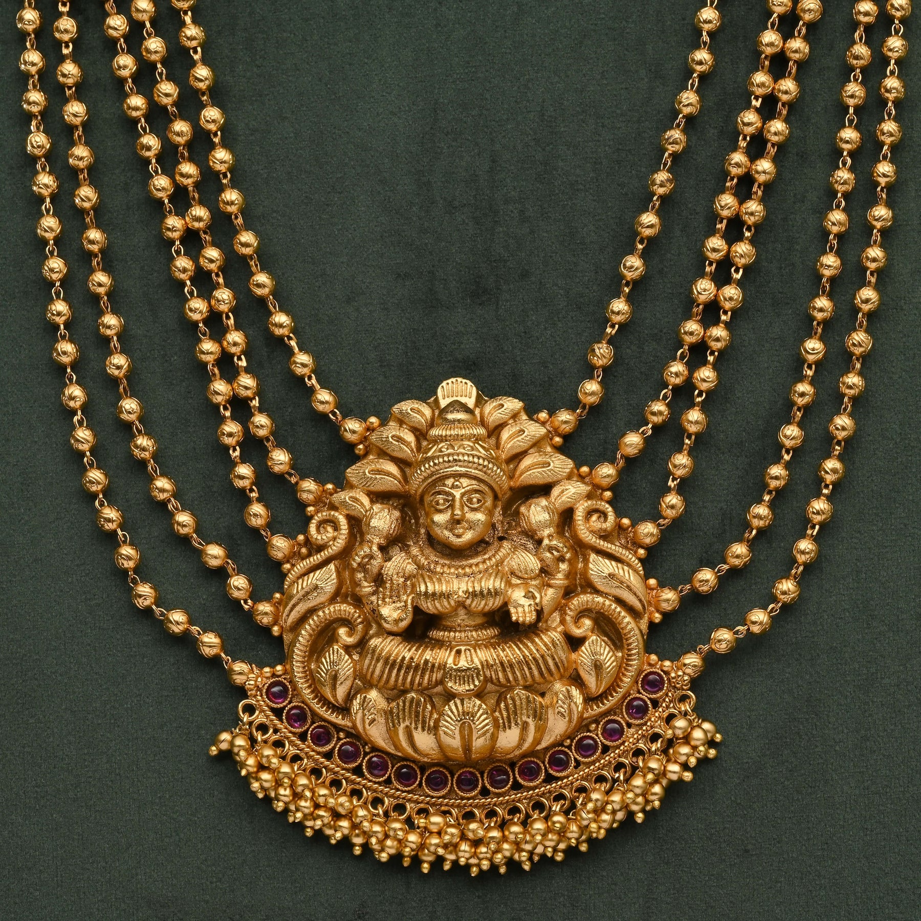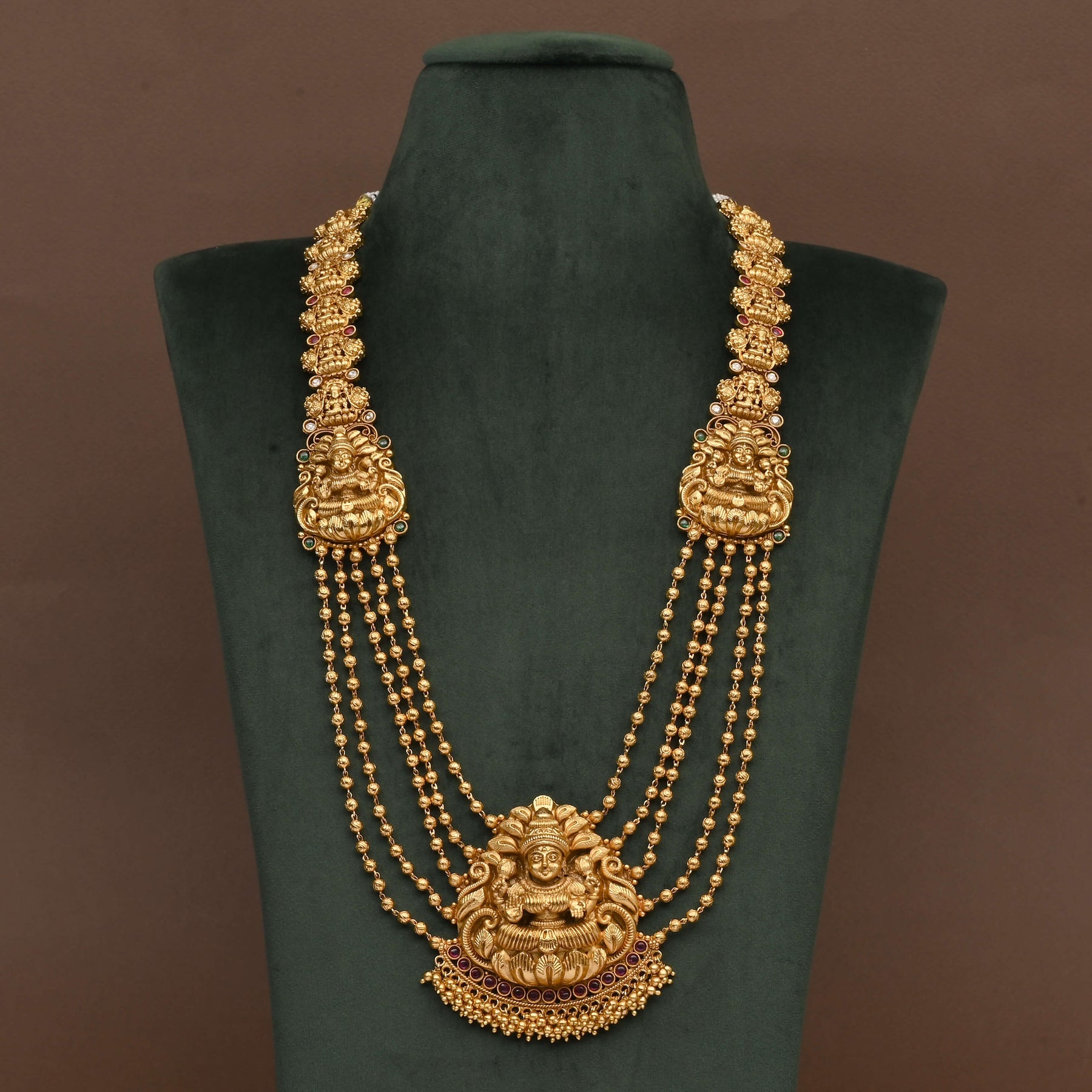 This Temple Necklace Set features an exclusive handcrafted design inspired by Goddess Lakshmi, embodying traditional artistry with a rich gold finish. Expertly crafted to resemble real gold, it offers the timeless elegance and cultural significance of classic temple jewelry, making it a perfect choice for those seeking authentic, heritage-inspired adornment.