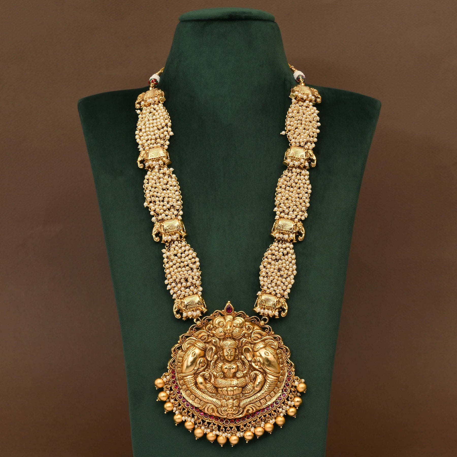 This exquisite Temple Necklace Set showcases a divine representation of Goddess Lakshmi, intricately crafted in a lustrous gold finish. Featuring elegant white pearl strands, it offers the timeless appeal of real gold with a unique, one-of-a-kind traditional design. Perfect for ceremonial occasions, this set enhances your ensemble with a rich cultural heritage and sophisticated craftsmanship.