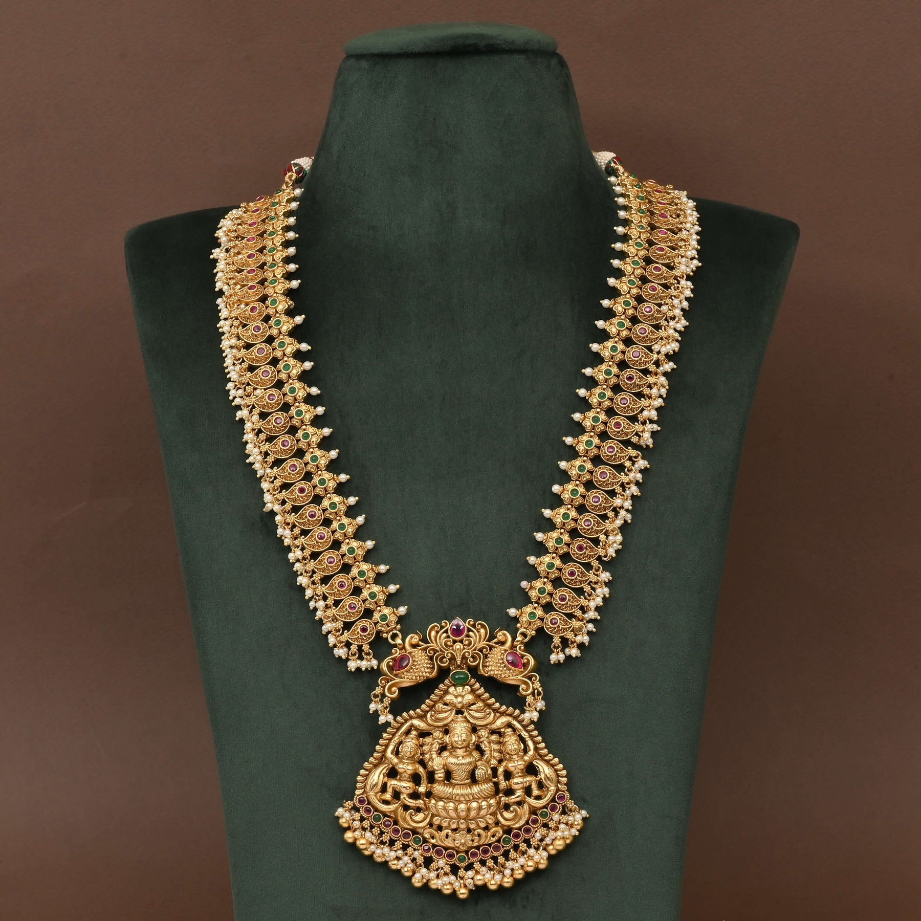 This Temple Necklace Set showcases an exquisite gold finish inspired by traditional craftsmanship. Featuring a detailed depiction of goddess Lakshmi, it offers the authentic look of real gold with a unique, one-of-a-kind design. Perfect for those seeking timeless elegance that honors cultural heritage with an expert touch.