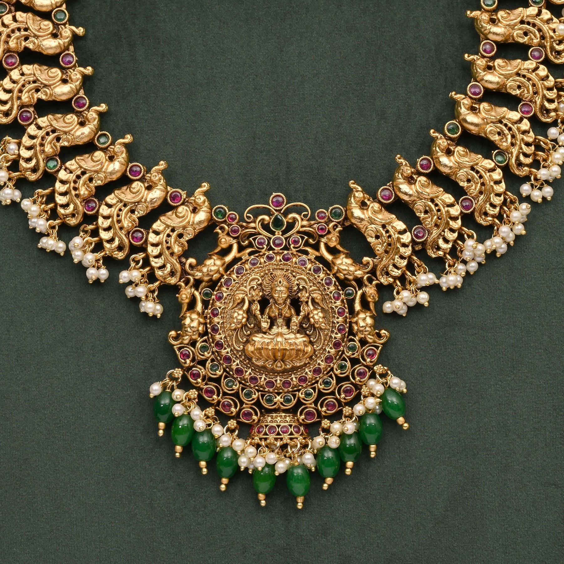 This Temple Necklace Set features an exclusive handcrafted design inspired by Goddess Lakshmi, embodying traditional elegance. Finished in a rich gold tone, it offers the authentic appearance of real gold, making it perfect for those seeking a classic yet distinguished accessory that honors cultural heritage.