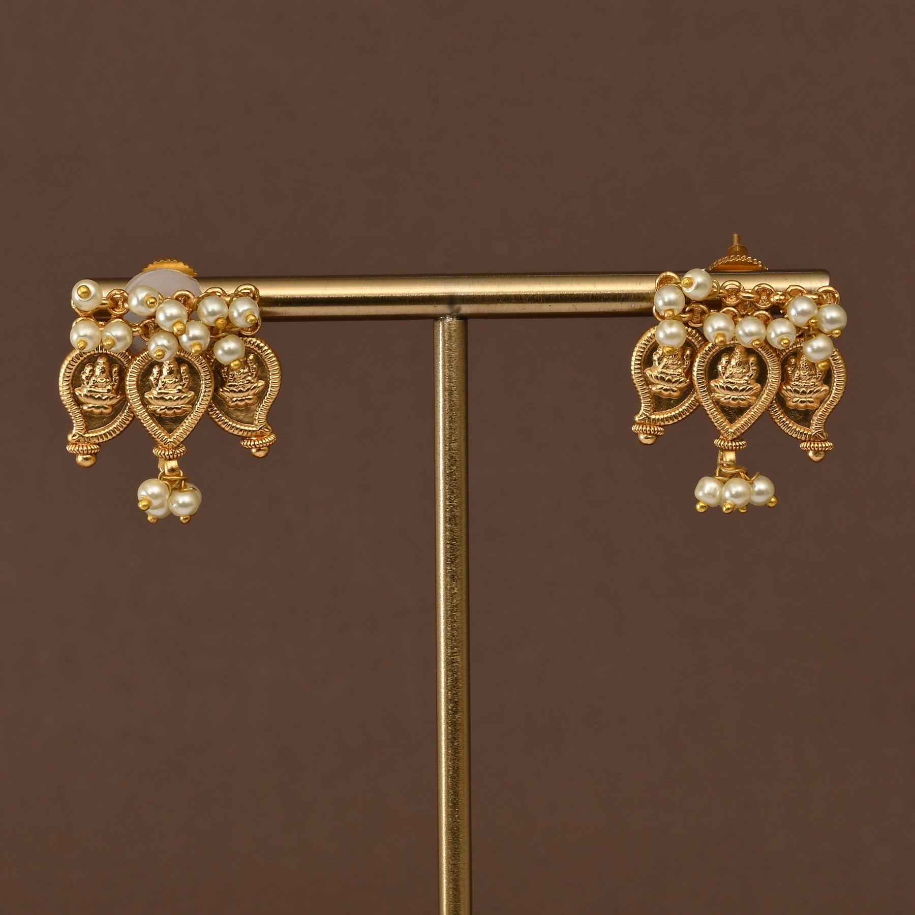 This handcrafted Temple Necklace Set features an exquisite Goddess Lakshmi pendant with an authentic gold finish, embodying divine elegance and spiritual significance. Each piece is meticulously created using traditional artisanal techniques, resulting in a truly unique design that honors centuries of jewelry-making heritage. The intricate detailing and lustrous gold-like appearance make it an ideal choice for religious ceremonies, festivals, and special occasions. A distinctive accessory that seamlessly blends devotional symbolism with refined craftsmanship.