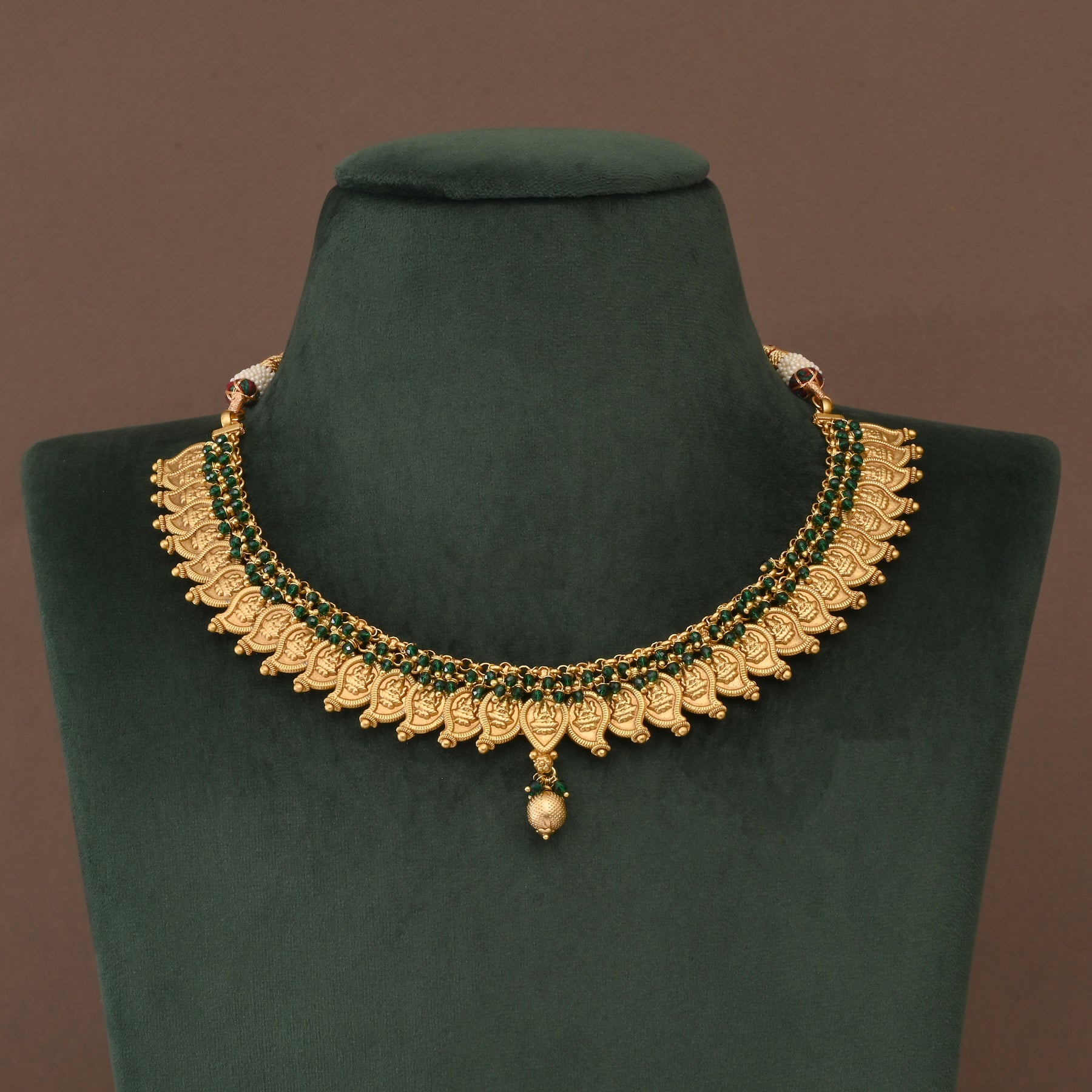 Elevate your traditional wardrobe with this exquisite Temple Necklace Set, crafted to capture the timeless elegance of temple jewelry. Each piece showcases authentic gold-look finishes paired with meticulous handcrafted detailing, ensuring no two sets are identical. The intricate design reflects centuries of jewelry-making heritage, making it a distinctive choice for festive occasions, weddings, or everyday sophistication. A true collector's piece that celebrates artisanal craftsmanship and cultural artistry.