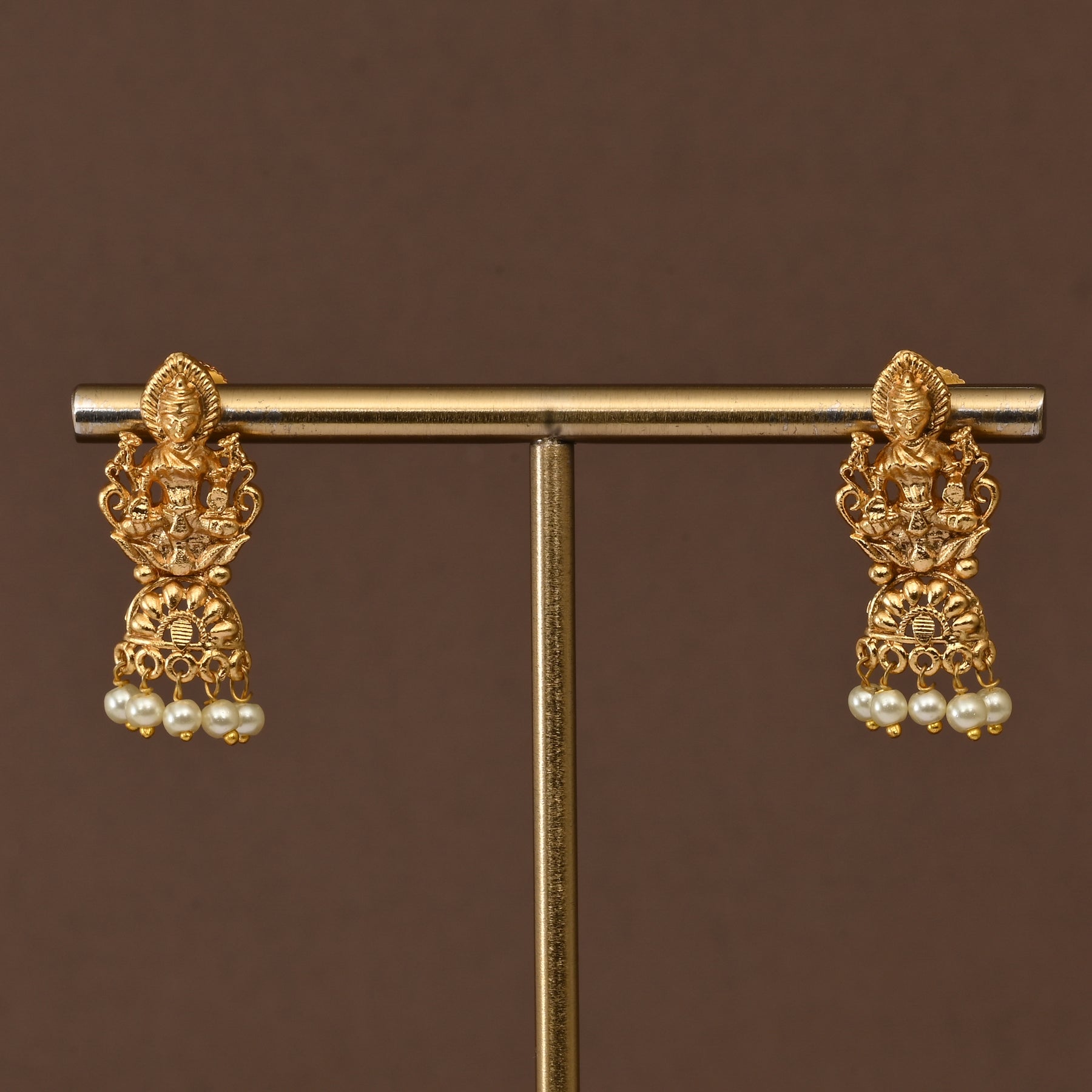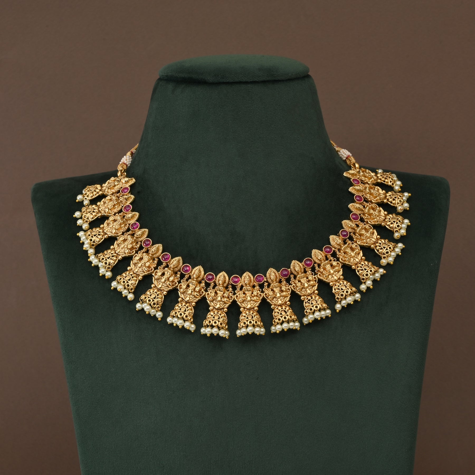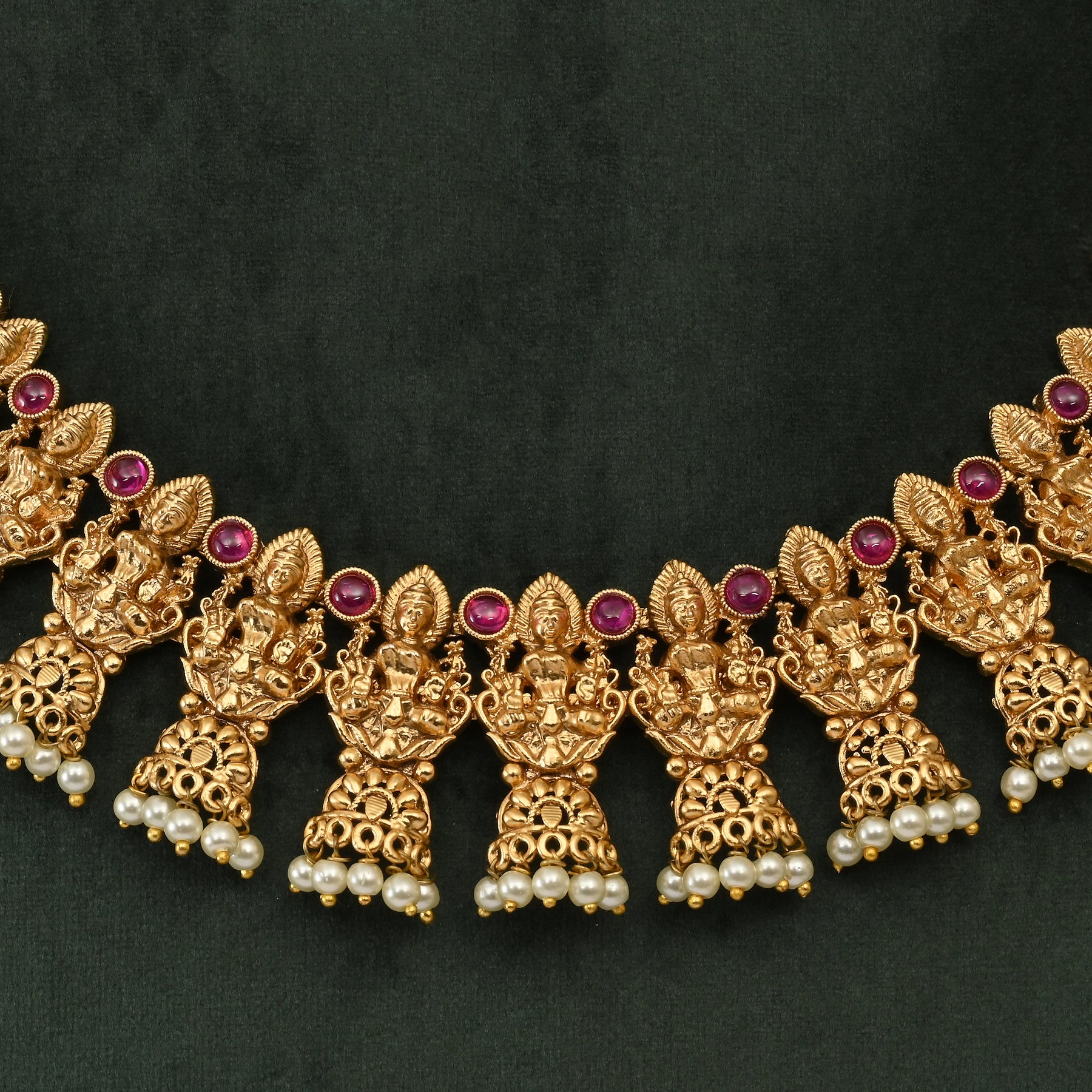 Elevate your spiritual elegance with this exquisite Temple Necklace Set, a handcrafted masterpiece inspired by Goddess Lakshmi. Each piece showcases authentic traditional design with a lustrous gold finish, capturing the divine essence of temple jewelry. Meticulously crafted by skilled artisans, this one-of-a-kind set combines timeless craftsmanship with sacred symbolism, making it an ideal choice for festivals, ceremonies, or those seeking to honor their heritage with distinctive, meaningful adornment.