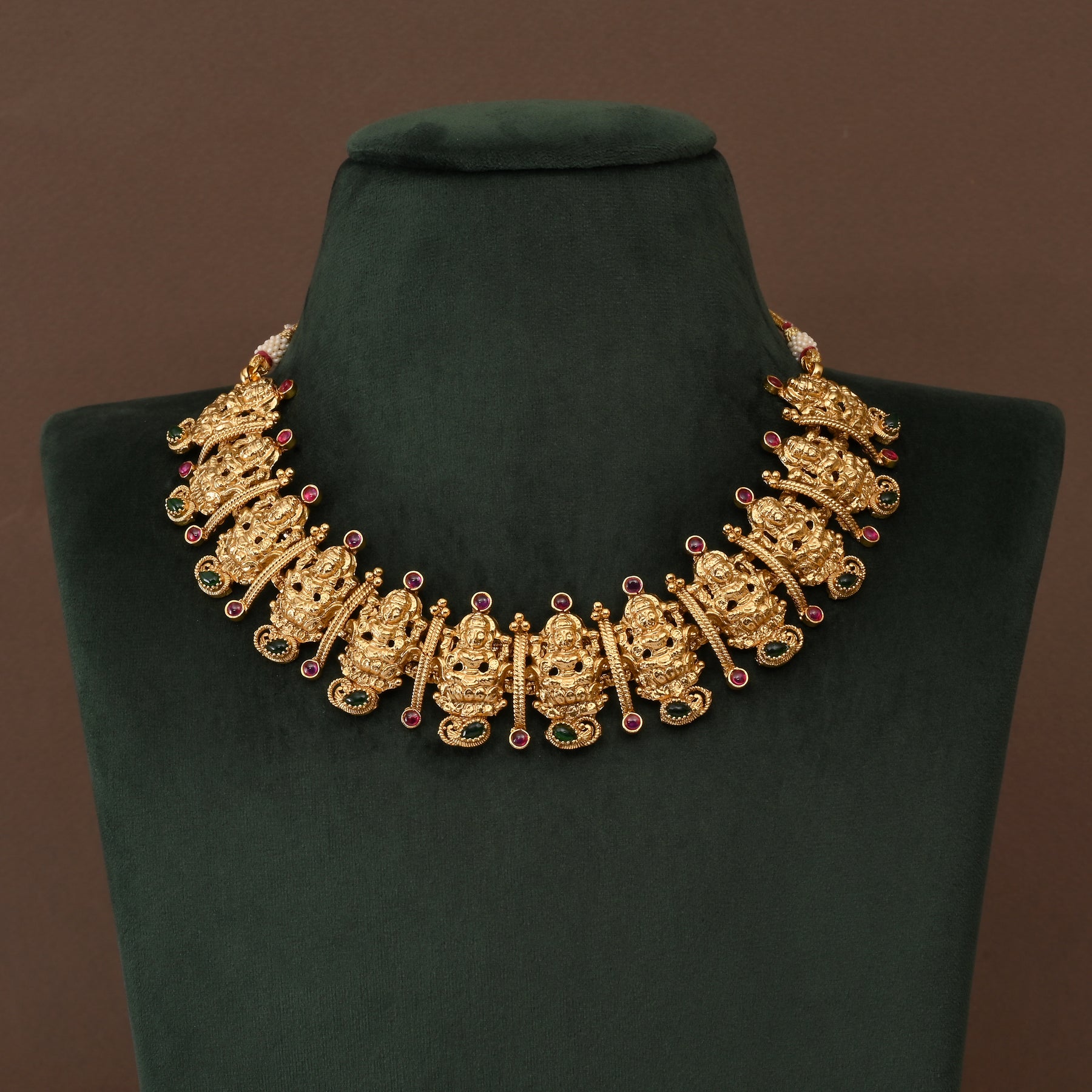 Elevate your spiritual elegance with this exquisite Temple Necklace Set, featuring a stunning Goddess Lakshmi pendant in authentic gold-look finish. Each piece is meticulously handcrafted using traditional techniques, showcasing intricate detailing that honors classical temple jewelry aesthetics. This one-of-a-kind design combines devotional significance with timeless beauty, making it an ideal choice for festivals, religious ceremonies, or everyday wear. The set's expert craftsmanship ensures durability while maintaining the delicate artistry characteristic of heritage jewelry. A meaningful addition to any collection that celebrates cultural tradition and divine grace.