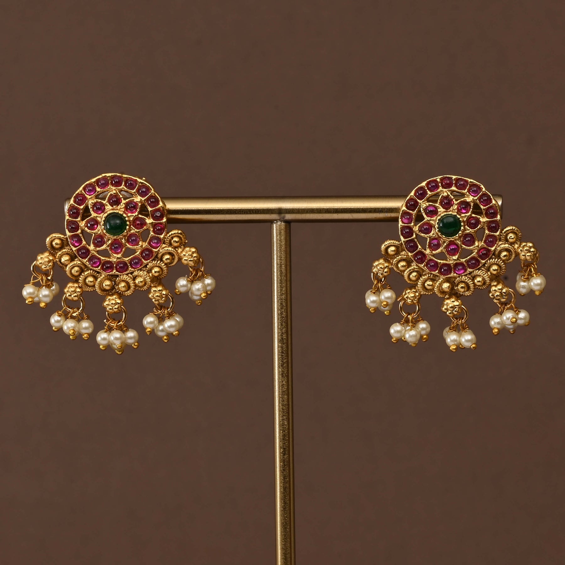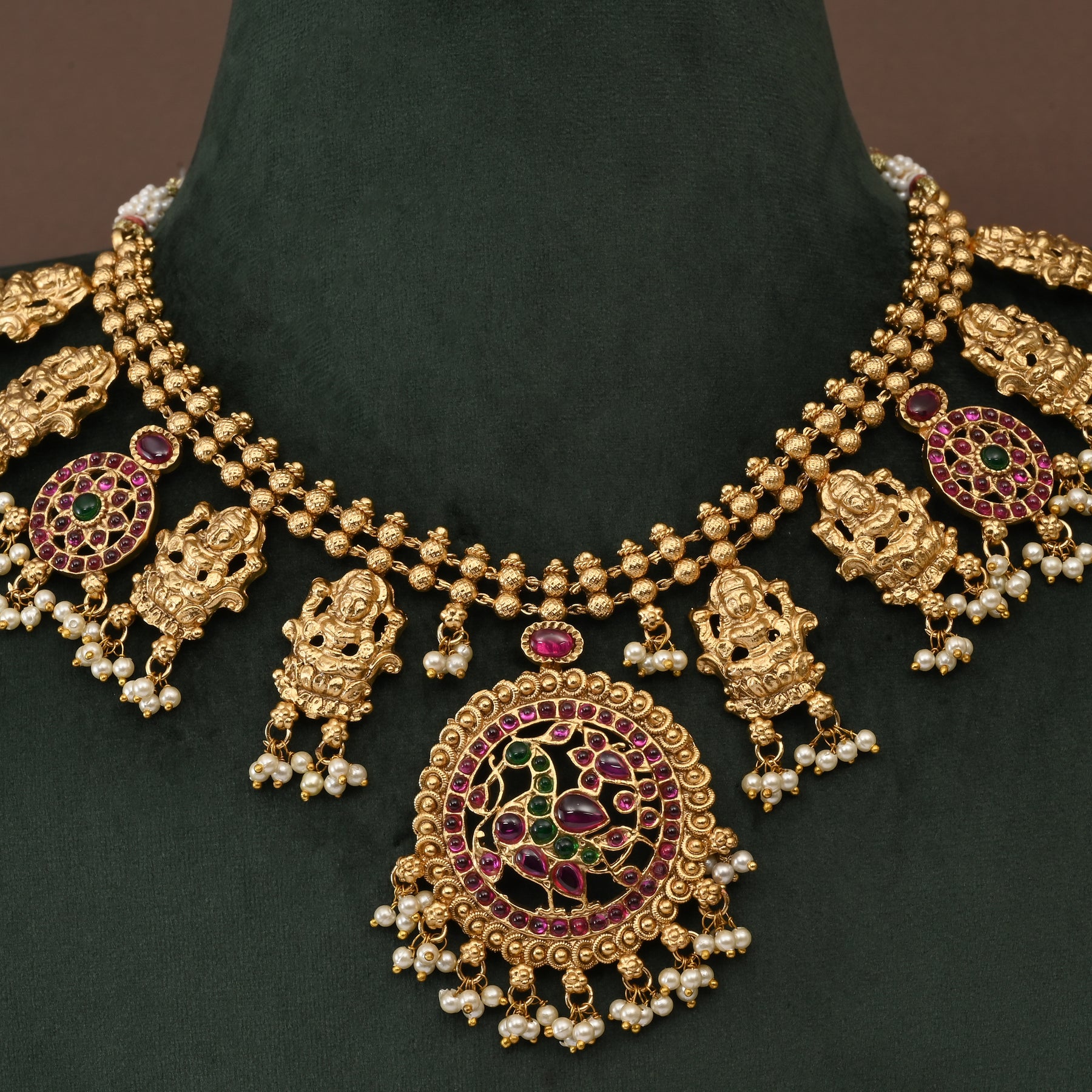 This Temple Necklace Set embodies divine elegance with its Goddess Lakshmi motif rendered in authentic gold-look finish. Crafted using traditional nakshi techniques, each piece demonstrates the artisan's mastery through intricate hand-worked details and ornamental flourishes. The design celebrates prosperity and grace, making it an ideal choice for auspicious occasions and spiritual celebrations. As a handcrafted creation, every set is uniquely individual, preserving the authenticity and soul of classical temple jewelry craftsmanship.