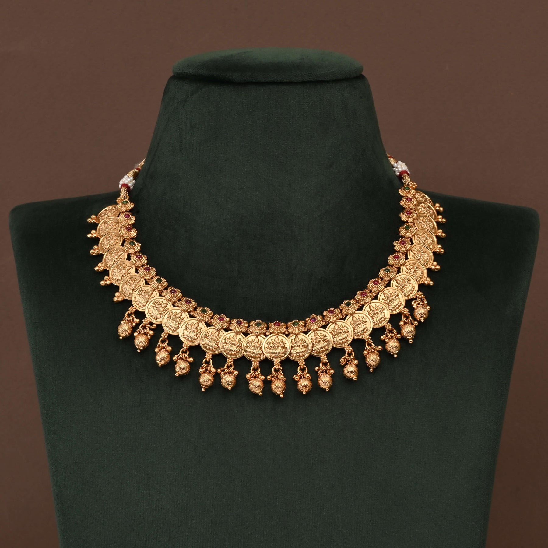 Elevate your spiritual elegance with this exquisite Temple Necklace Set, featuring a radiant Goddess Lakshmi coin design in a lustrous gold finish. Each piece is meticulously handcrafted, embodying traditional artistry and timeless devotion. The intricate detailing captures the divine essence of the goddess, making it a meaningful addition to your jewelry collection. As a one-of-a-kind creation, this necklace set celebrates both cultural heritage and individual craftsmanship, perfect for those who appreciate authentic, sacred adornments.