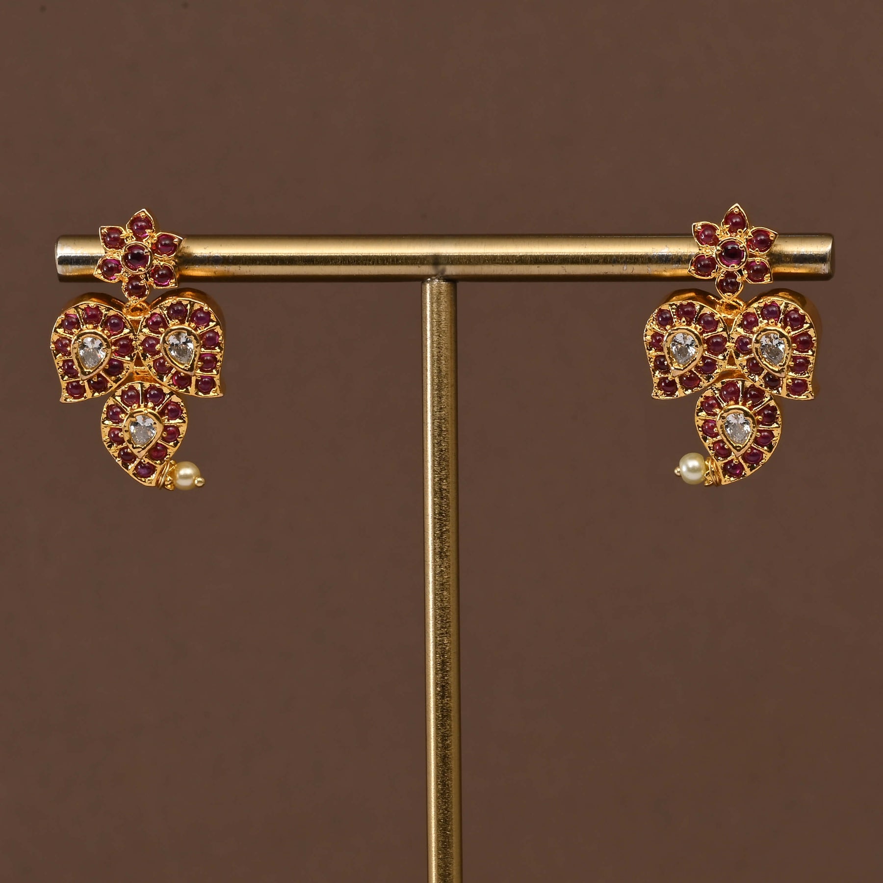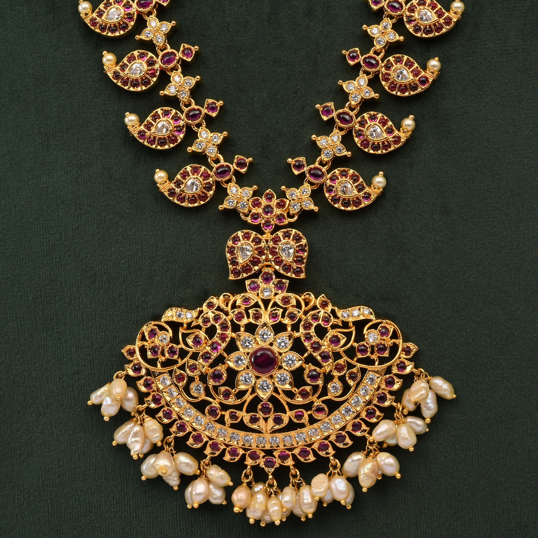 Elevate your traditional ensemble with this exquisite Temple Necklace Set, a masterpiece of authentic craftsmanship. Featuring intricate mango motifs rendered in lustrous gold-toned finish, each piece showcases the revered nakshi technique—a time-honored metalwork tradition. Meticulously handcrafted by skilled artisans, this one-of-a-kind set captures the essence of temple jewelry with its ornate detailing and cultural significance. Perfect for festive occasions, weddings, or adding timeless elegance to your collection. A wearable work of art that celebrates heritage and artisanal excellence.