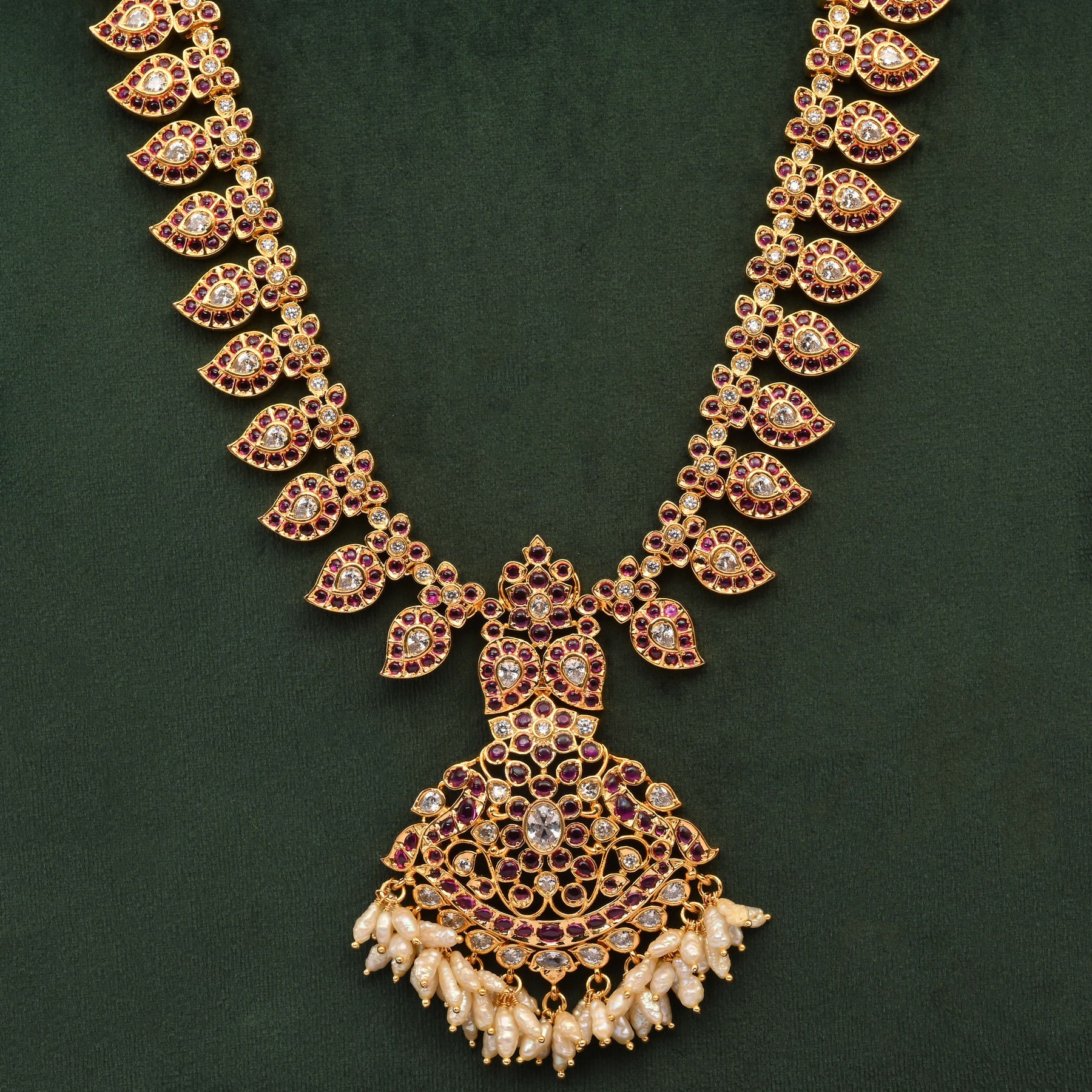 Elevate your traditional ensemble with this exquisite Temple Necklace Set, a masterpiece of handcrafted artistry. Featuring an authentic mango motif rendered in intricate nakshi style, this piece captures the essence of classical temple jewelry. The lustrous gold finish complements the ornate detailing, while each set is meticulously crafted to be truly one of a kind. Perfect for festive occasions, weddings, or cultural celebrations, this necklace embodies timeless elegance and the finest traditions of Indian jewelry craftsmanship.