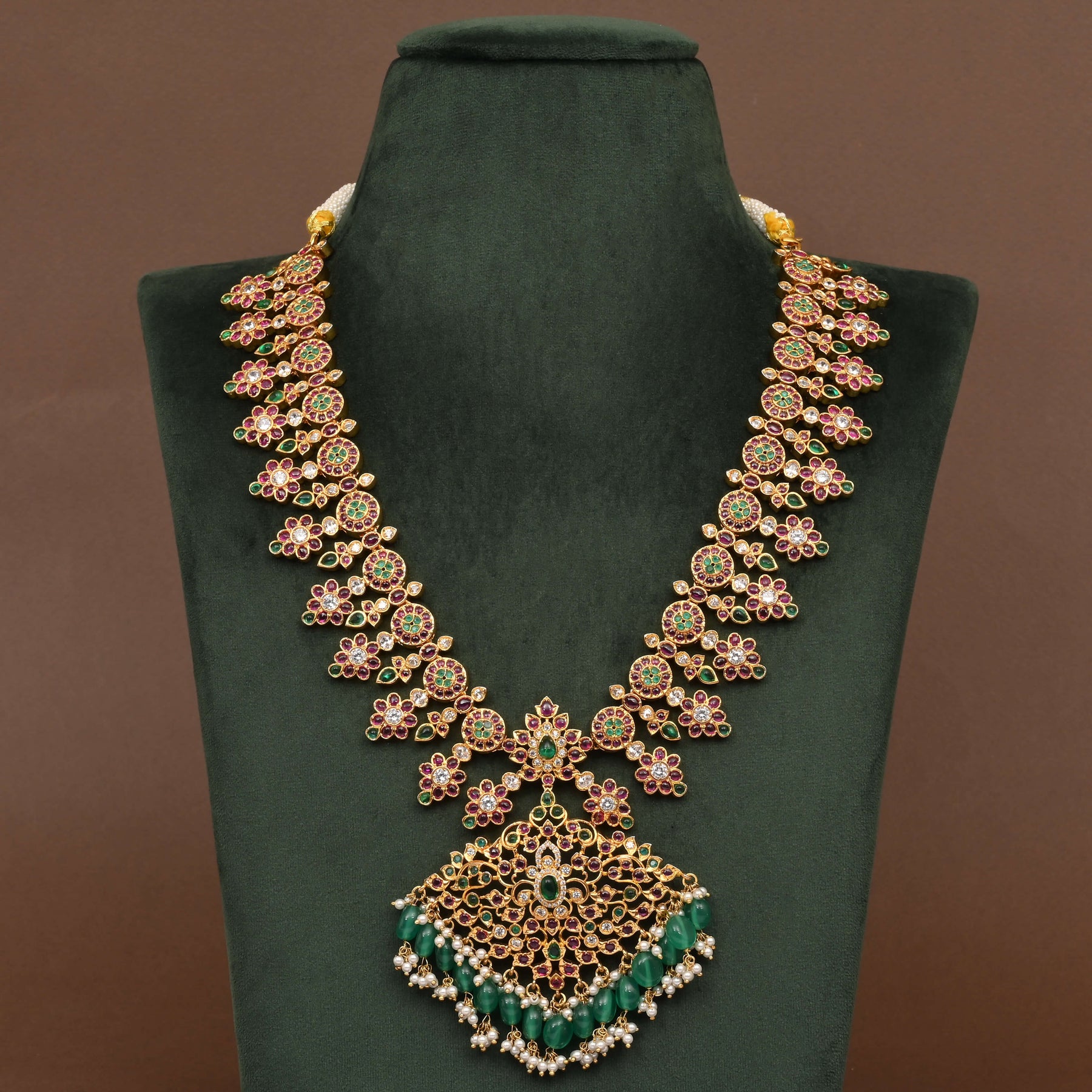 Elevate your traditional ensemble with this exquisite Temple Necklace Set, crafted in authentic Nakshi style. Each piece showcases meticulous handcrafted detailing that captures the essence of temple jewelry artistry. The lustrous gold finish complements classical designs, making it an ideal choice for festivals, weddings, and special occasions. As a one-of-a-kind creation, this set reflects the skilled craftsmanship of artisans who honor time-honored techniques. Perfect for those who appreciate genuine, heirloom-quality jewelry with cultural significance and timeless appeal.