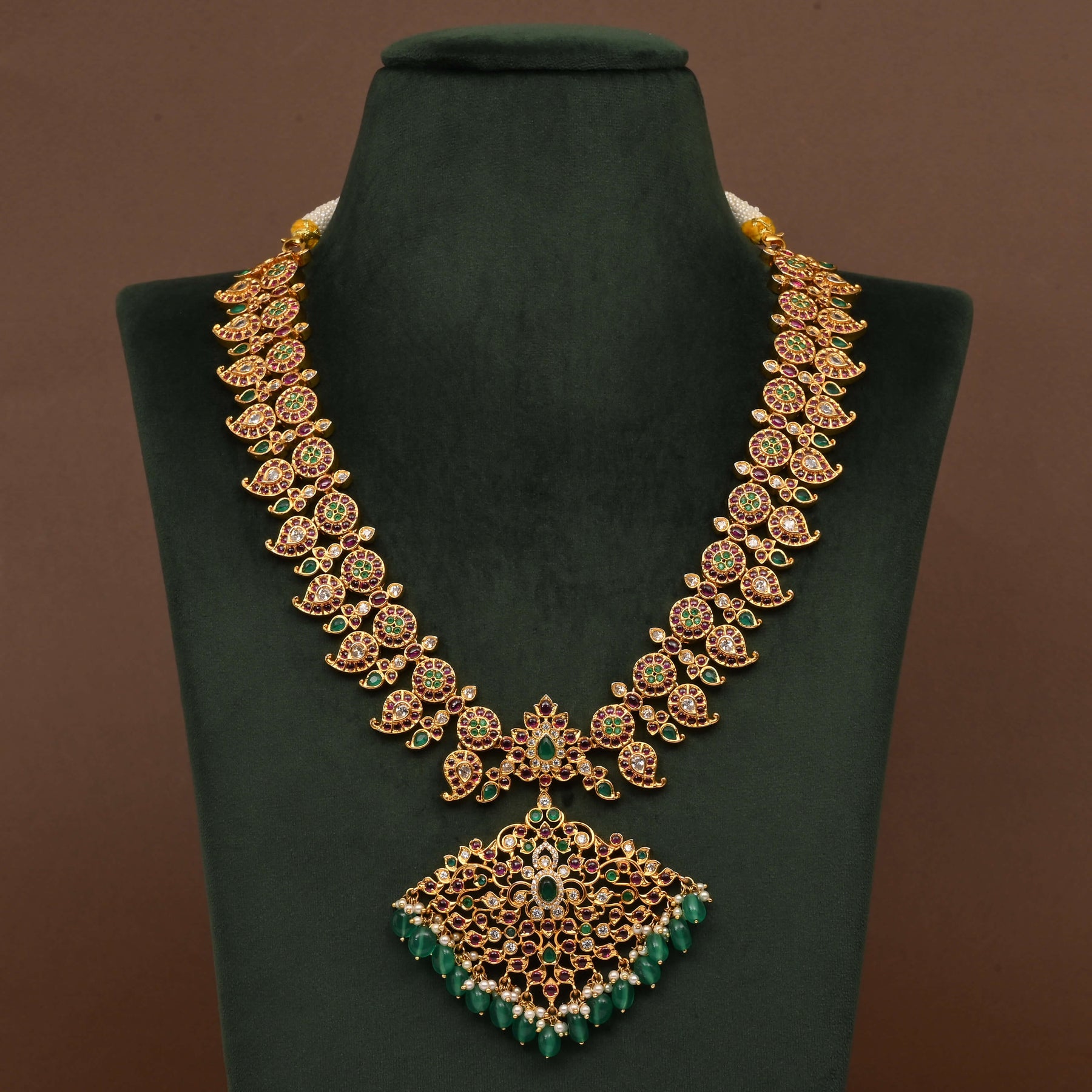 Elevate your traditional ensemble with this exquisite Temple Necklace Set, crafted in authentic gold-look finish. Each piece showcases intricate Nakshi detailing—a time-honored technique where artisans hand-sculpt elaborate patterns into the metal. This one-of-a-kind creation blends heritage craftsmanship with timeless elegance, making it an ideal choice for festivals, weddings, and special occasions. The set's traditional design celebrates classical Indian jewelry artistry while the handcrafted quality ensures no two pieces are identical. A treasured addition to any fine jewelry collection.