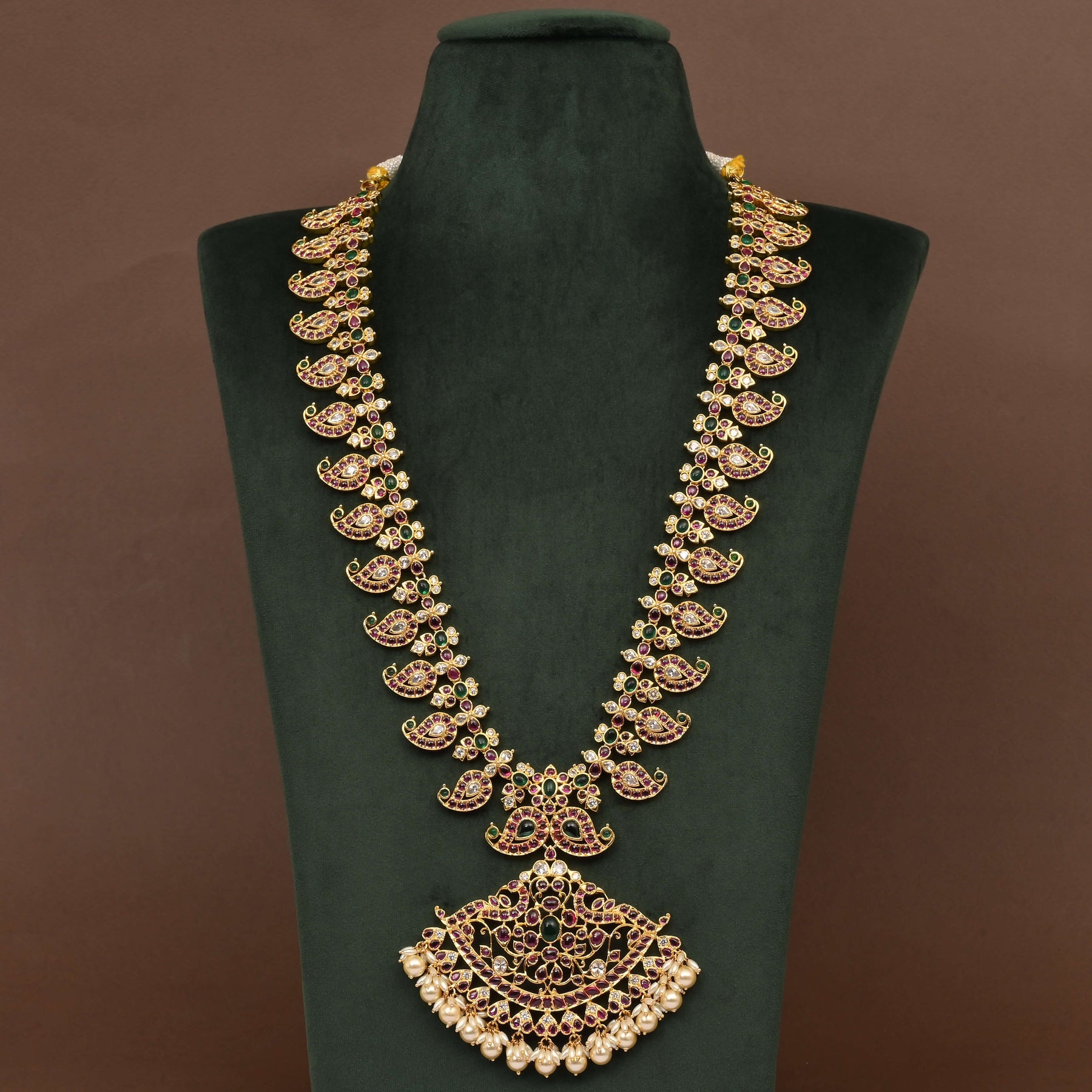 Elevate your traditional ensemble with this exquisite Temple Necklace Set, featuring an authentic mango motif rendered in lustrous gold-look finish. Each piece showcases intricate nakshi craftsmanship, where skilled artisans hand-carve delicate details into the metal, creating dimensional patterns that catch light beautifully. This one-of-a-kind set embodies the heritage of temple jewelry design, blending classical aesthetics with meticulous handwork. Perfect for festive occasions, weddings, or cultural celebrations, it serves as a timeless investment in artisanal jewelry that honors traditional techniques while making a sophisticated statement.