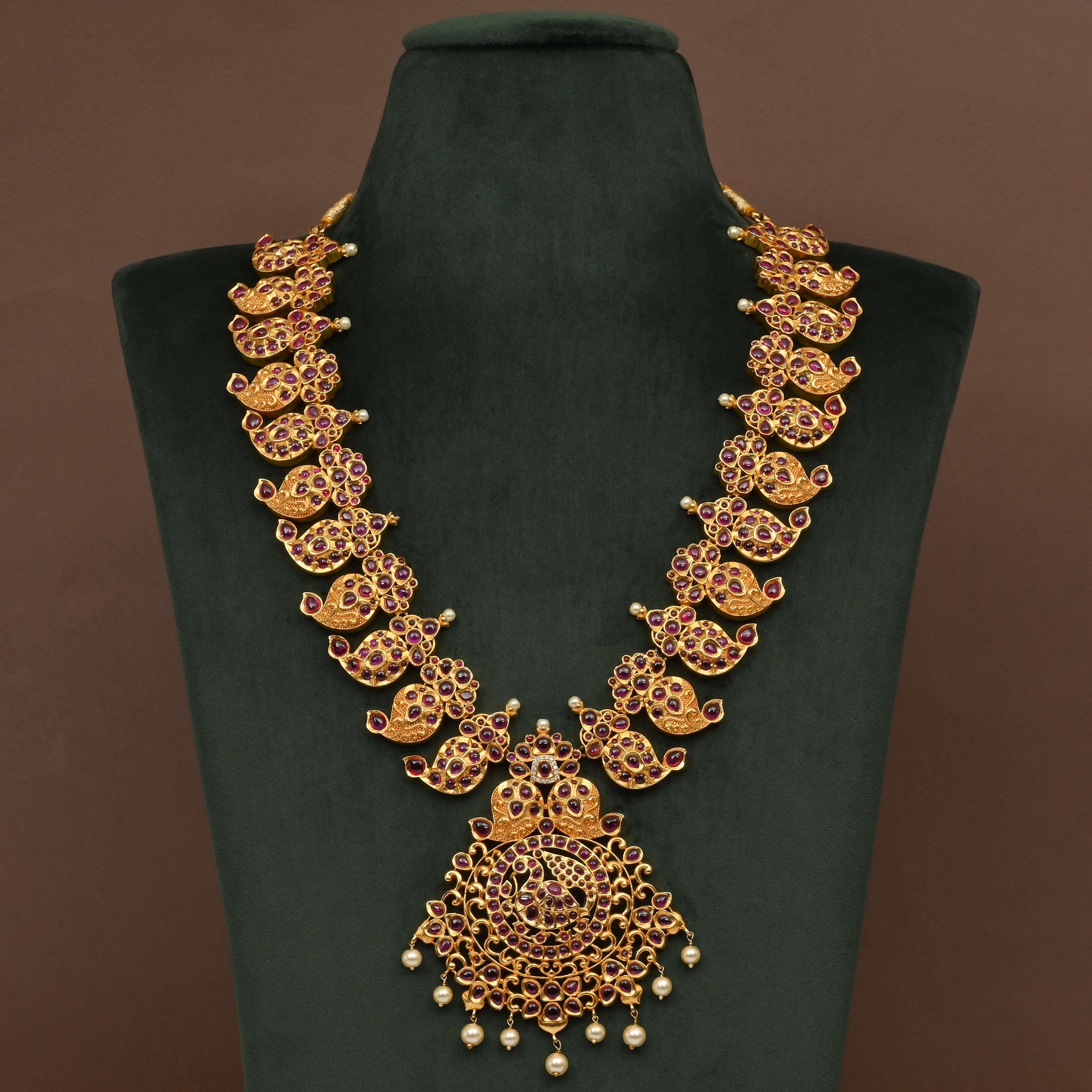 Temple Necklace Set showcases authentic nakshi craftsmanship with an exquisite mango motif design. This handcrafted piece features a lustrous gold finish that captures traditional temple jewelry aesthetics. Each set is meticulously created by skilled artisans, making it a distinctive one-of-a-kind creation. Perfect for those who appreciate heritage jewelry with intricate detailing and timeless elegance.
