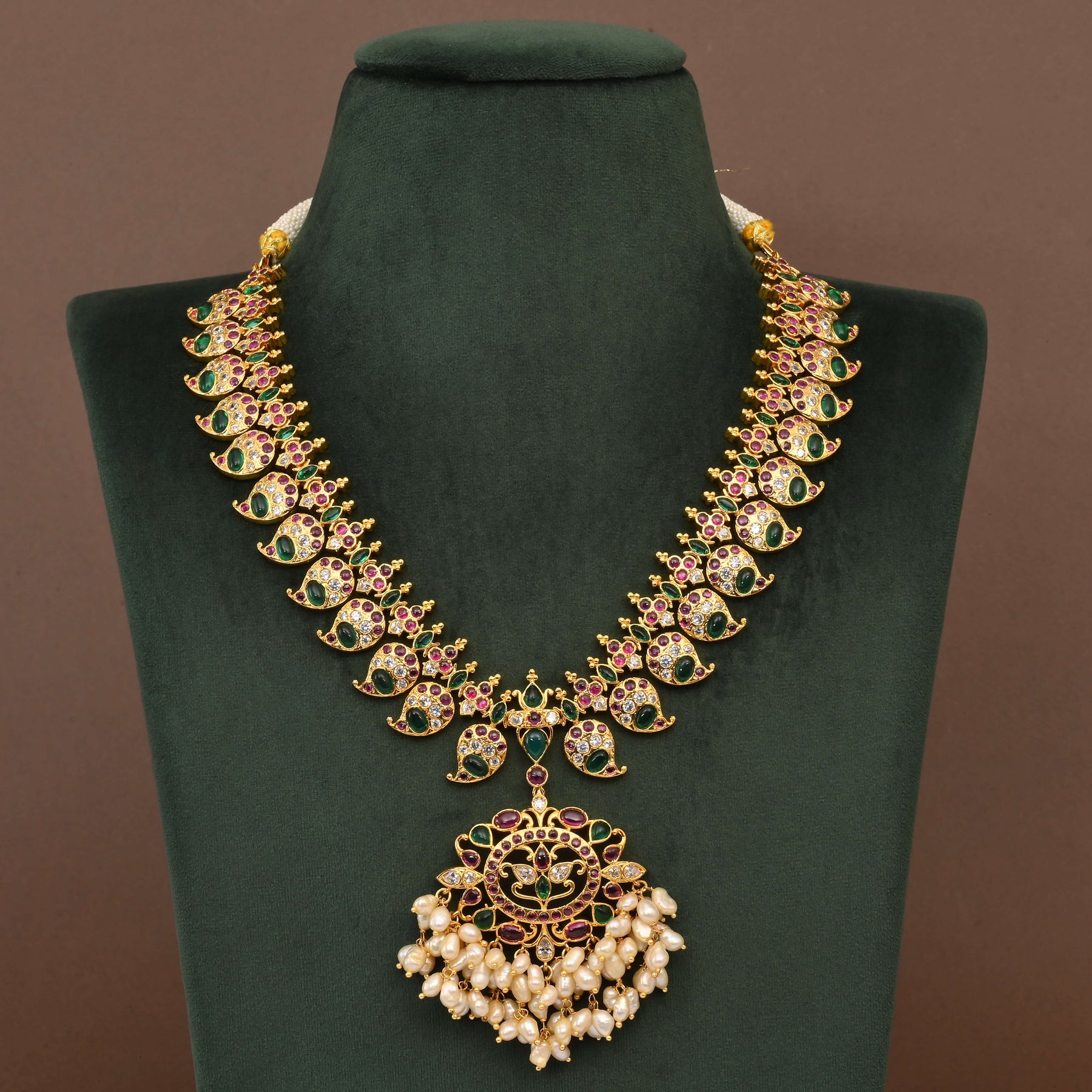 Elevate your traditional ensemble with this exquisite Temple Necklace Set, a masterpiece of handcrafted artistry. Featuring authentic nakshi work in lustrous gold finish, embodying divine elegance. Each element is meticulously crafted by skilled artisans, preserving centuries-old temple jewelry traditions. Perfect for festive occasions, weddings, or spiritual ceremonies, this set combines timeless design with exceptional craftsmanship. A treasured addition to any fine jewelry collection.