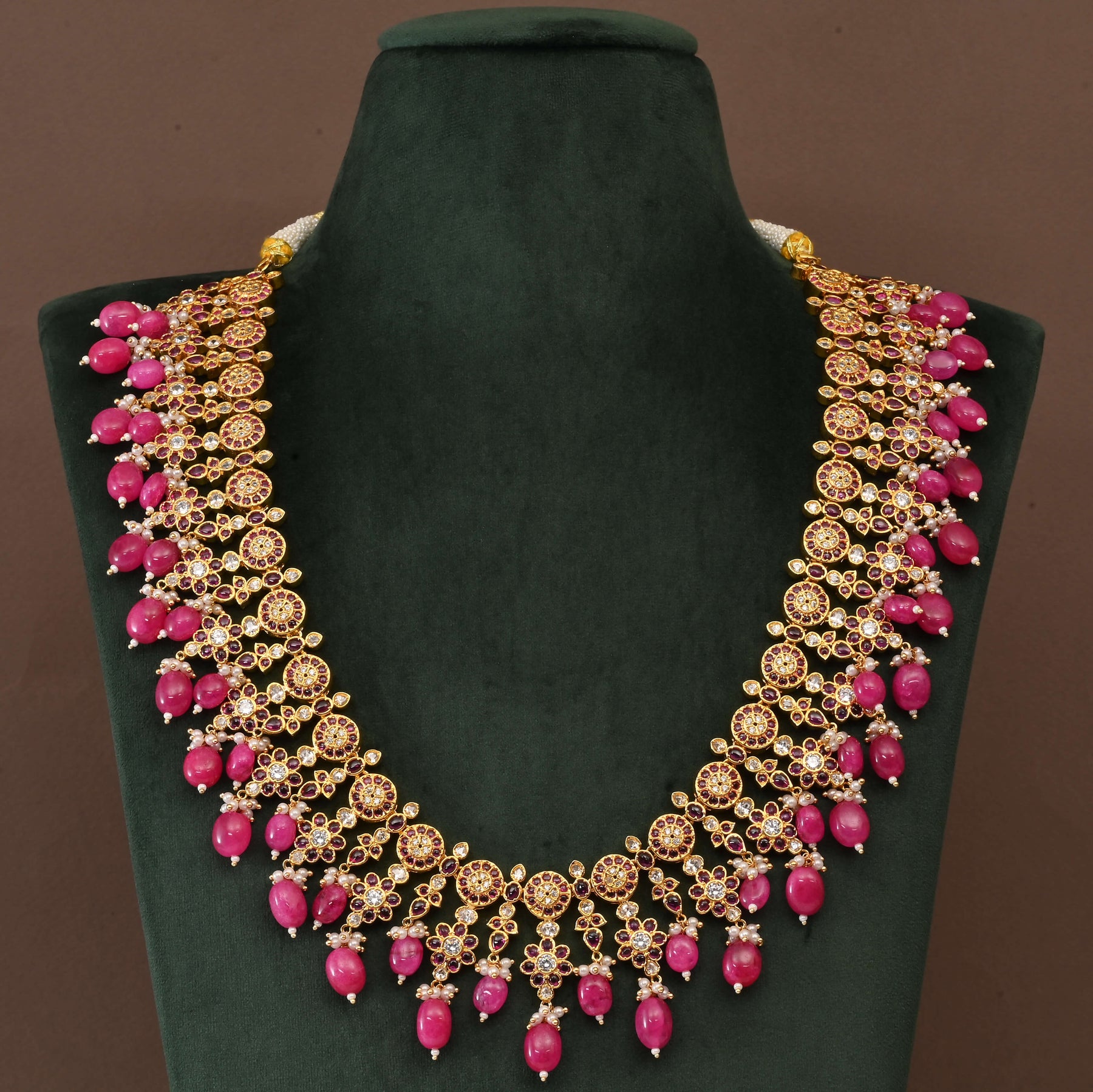 Elevate your traditional ensemble with this exquisite Temple Necklace Set, a masterpiece of handcrafted artistry. Featuring an authentic gold finish with intricate nakshi detailing. Each element is meticulously crafted to reflect traditional temple jewelry aesthetics, making it an ideal choice for religious ceremonies, festivals, and special occasions. The expert workmanship ensures durability while maintaining the authentic charm of classical design. A timeless investment that celebrates heritage and spiritual significance.