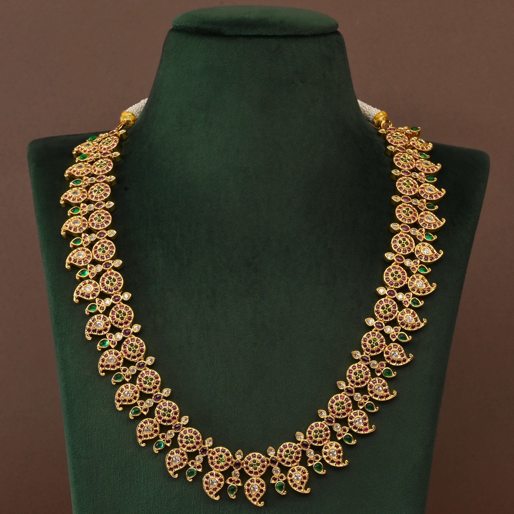 Elevate your traditional ensemble with this exquisite Temple Necklace Set, a masterpiece of handcrafted artistry. Featuring authentic nakshi work in lustrous gold finish, this one-of-a-kind piece showcases the divine presence of Goddess Lakshmi, embodying spiritual grace and timeless elegance. Each intricate detail reflects meticulous craftsmanship, making it an ideal choice for festivals, weddings, and sacred occasions. A treasured addition to any jewellery collection, this temple necklace set seamlessly blends heritage aesthetics with refined sophistication.