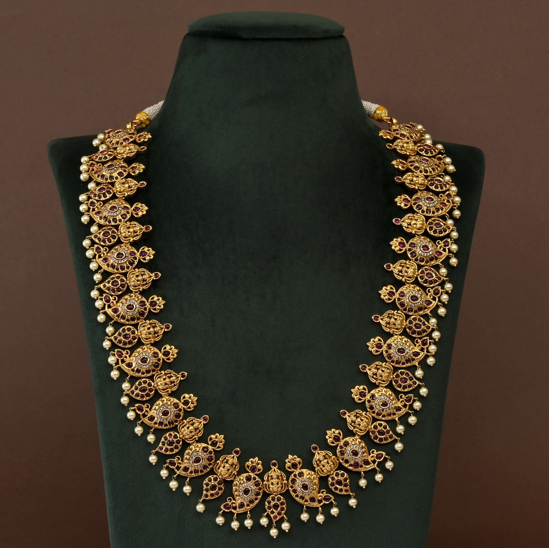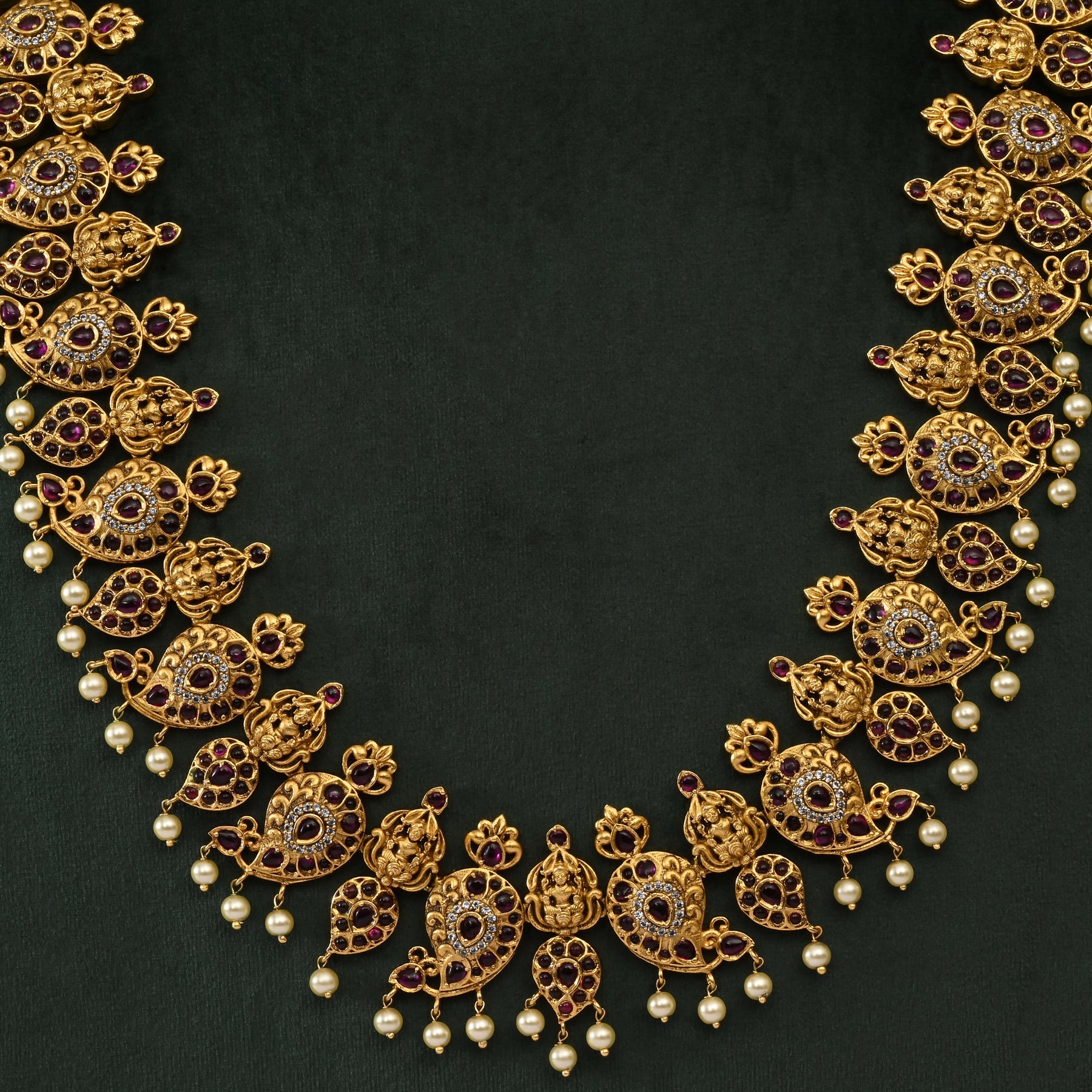Embrace timeless elegance with this exquisite Temple Necklace Set, a masterpiece of traditional craftsmanship. Featuring an authentic mango mala design with intricate nakshi work. Each necklace is meticulously created as a one-of-a-kind treasure, blending classical temple jewelry aesthetics with expert artisanal techniques. Perfect for festive occasions, spiritual ceremonies, or as a cherished heirloom, this set embodies the richness of heritage jewelry craftsmanship.