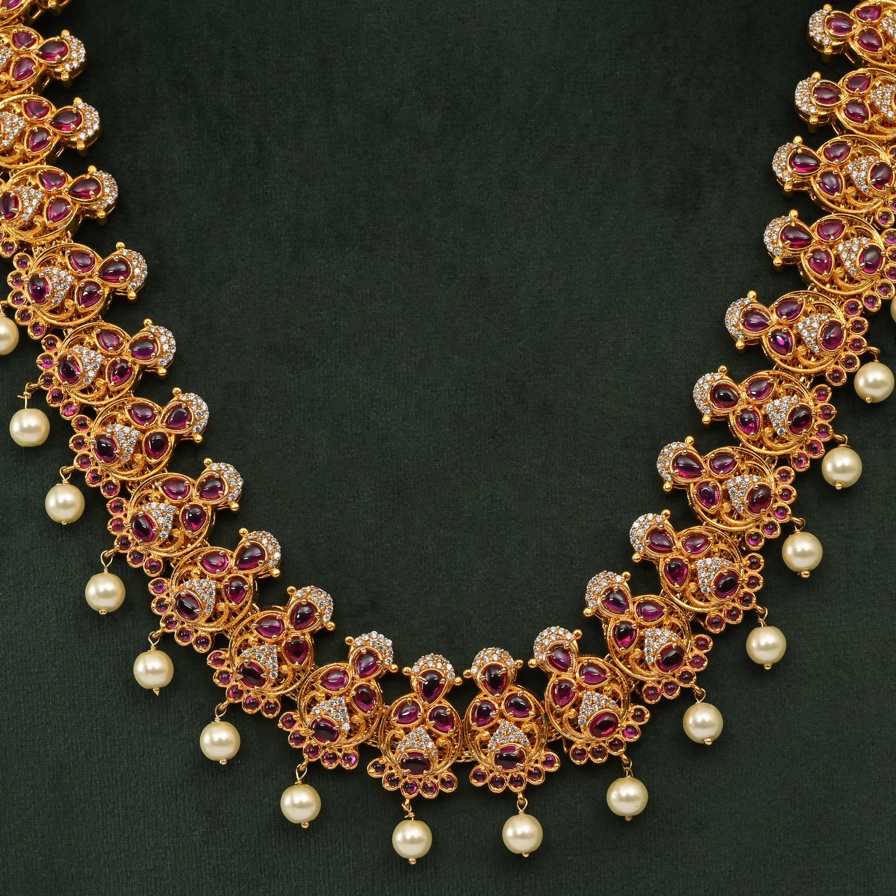 Elevate your traditional ensemble with this exquisite Temple Necklace Set, featuring an authentic gold finish that captures timeless elegance. Handcrafted with meticulous attention to detail, embodying prosperity and grace. Each necklace reflects the artistry of traditional jewelry-making techniques, making it a treasured addition to your collection. Perfect for festivals, celebrations, or everyday wear, this temple jewelry set combines spiritual significance with refined craftsmanship.