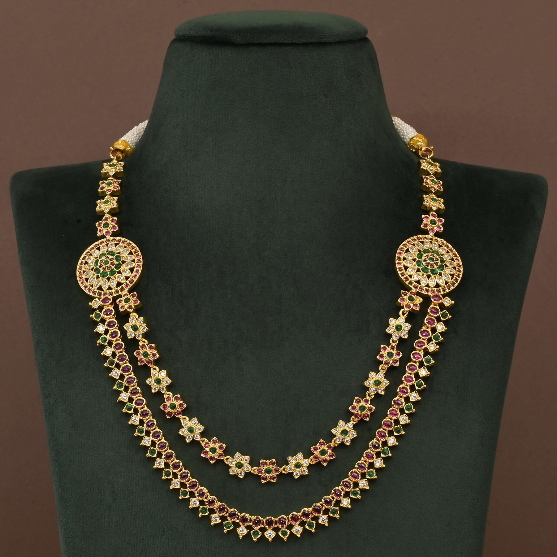 Elevate your traditional ensemble with this exquisite Temple Necklace Set, featuring an authentic gold finish that captures timeless elegance. Each necklace reflects the artistry of traditional temple jewelry design, making it an ideal choice for festive occasions, religious ceremonies, or as a cherished heirloom. The intricate craftsmanship ensures durability while maintaining the spiritual significance treasured in Indian jewelry traditions.