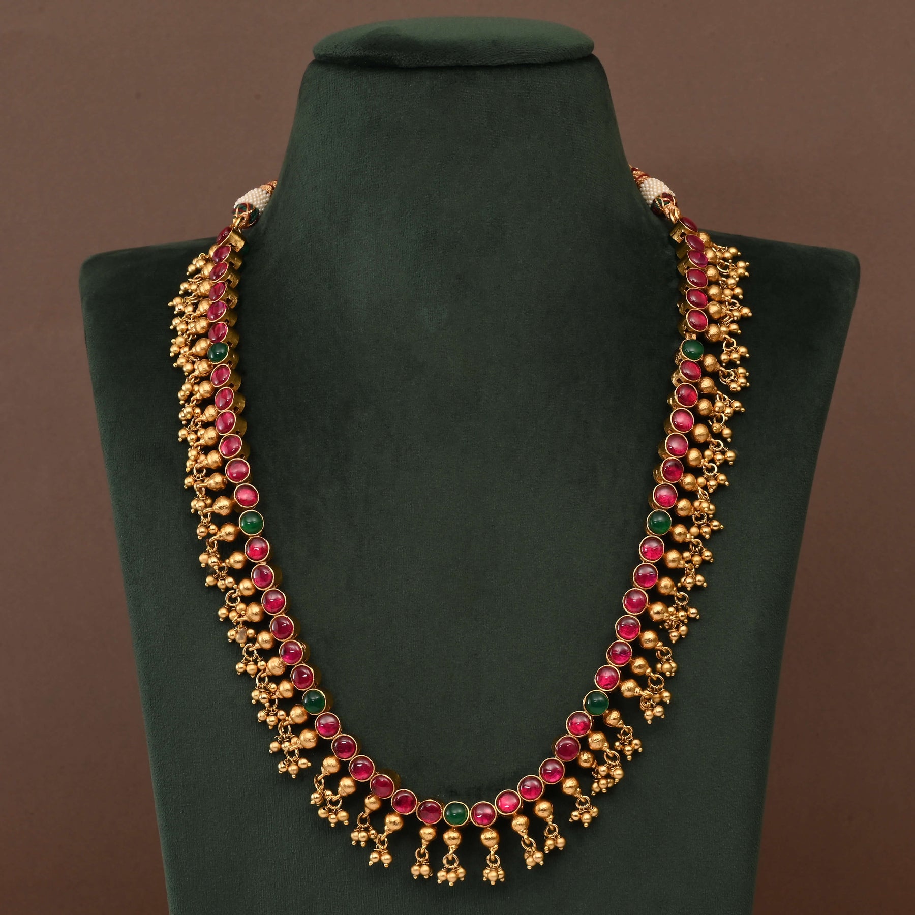 Elevate your traditional ensemble with this exquisite Temple Necklace Set, featuring an authentic gold finish that captures timeless elegance. Handcrafted with meticulous attention to detail, this one-of-a-kind piece showcases the divine imagery of Goddess Lakshmi, embodying prosperity and grace. Each necklace reflects the artistry of traditional craftsmanship, making it an ideal choice for festivals, weddings, or special occasions. The intricate design and superior quality ensure this heirloom-worthy set becomes a cherished addition to your jewellery collection.