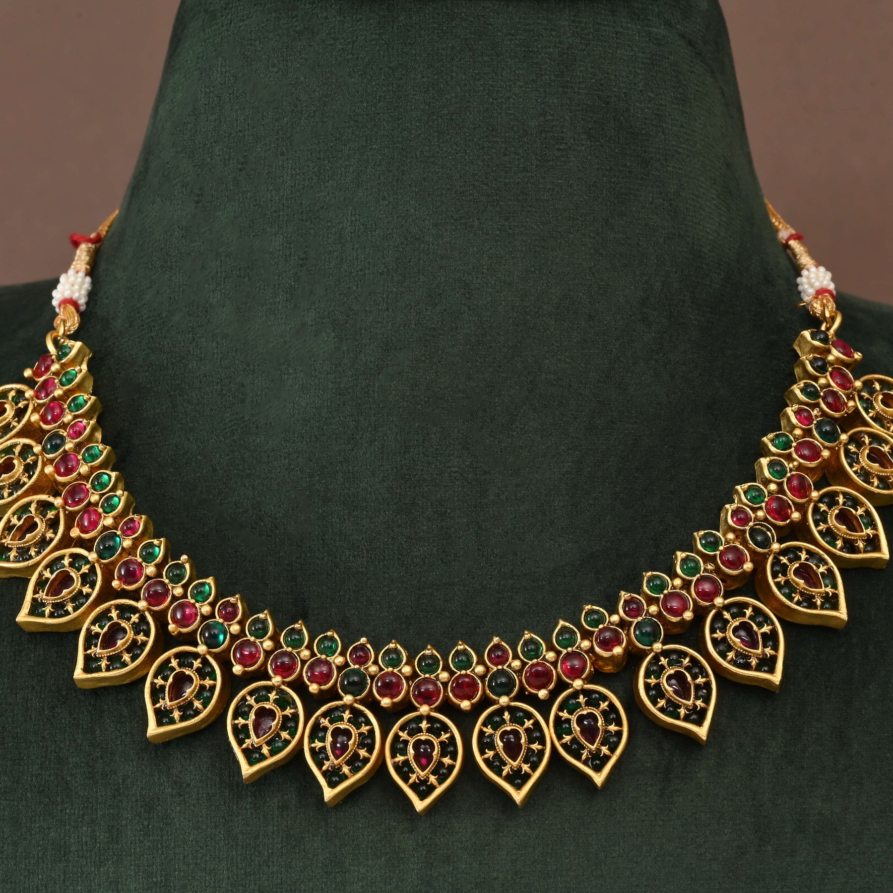 Elevate your traditional ensemble with this exquisite Temple Necklace Set, a masterpiece of handcrafted artistry. Featuring authentic nakshi work in lustrous gold finish, this one-of-a-kind piece showcases the divine presence of Goddess Lakshmi, embodying prosperity and grace. Each detail reflects meticulous craftsmanship, blending classical temple design with contemporary elegance. Perfect for festive occasions, weddings, or spiritual celebrations, this necklace set captures the essence of timeless Indian heritage. A treasured addition to any jewellery collection, it stands as a testament to traditional goldsmith excellence.