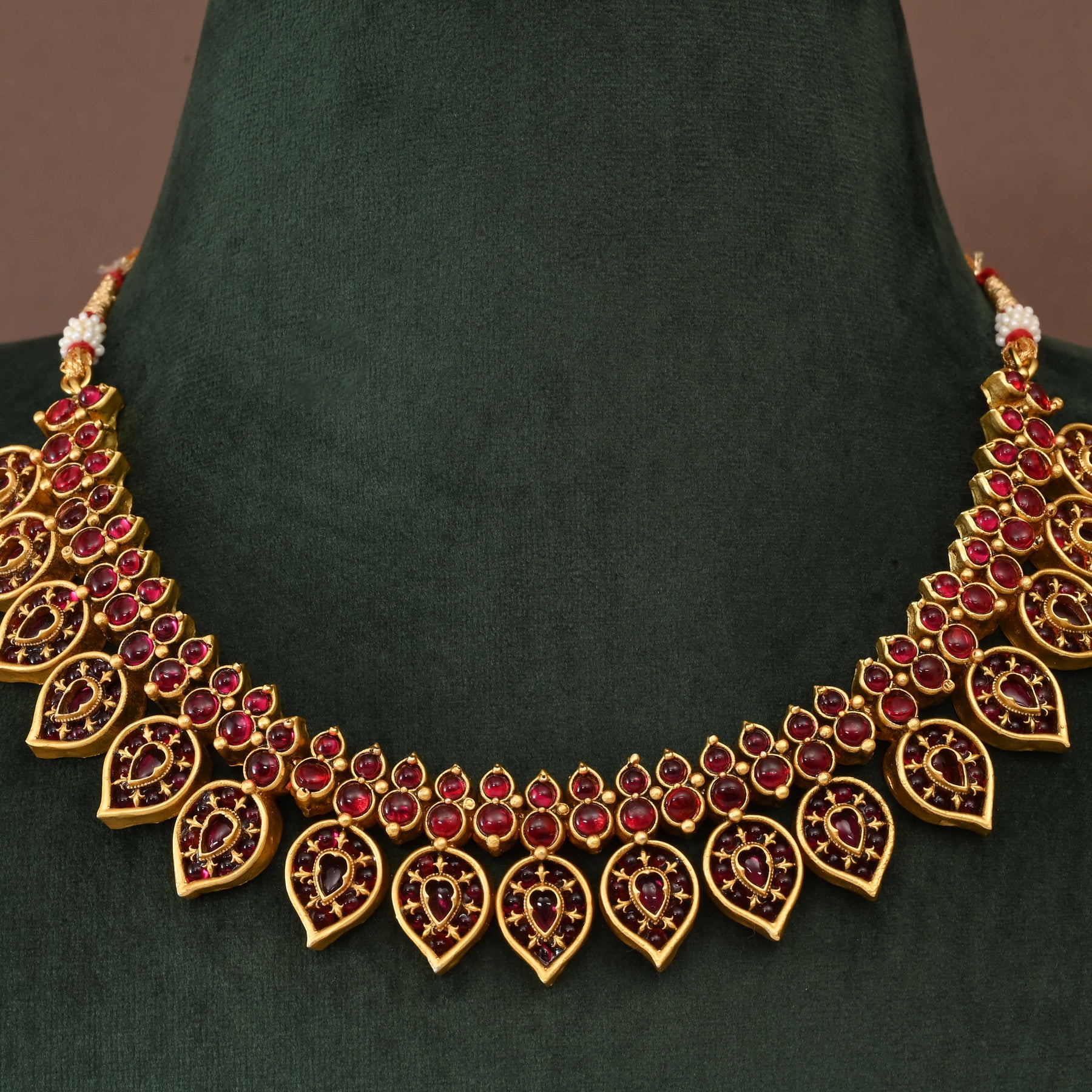 Elevate your spiritual elegance with this exquisite Temple Necklace Set, featuring an authentic nakshi design. Handcrafted with meticulous attention to detail, each piece showcases the timeless artistry of traditional temple jewelry. The lustrous gold finish captures the warmth and radiance of precious metal, while the intricate workmanship ensures this is truly one of a kind. Perfect for festivals, religious ceremonies, or those who appreciate the cultural significance and artistic mastery of heritage jewelry. A treasured addition to any collection.