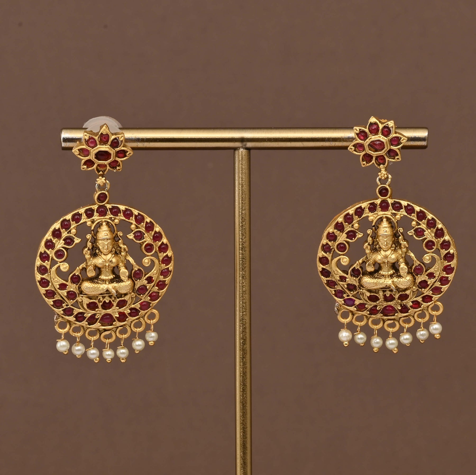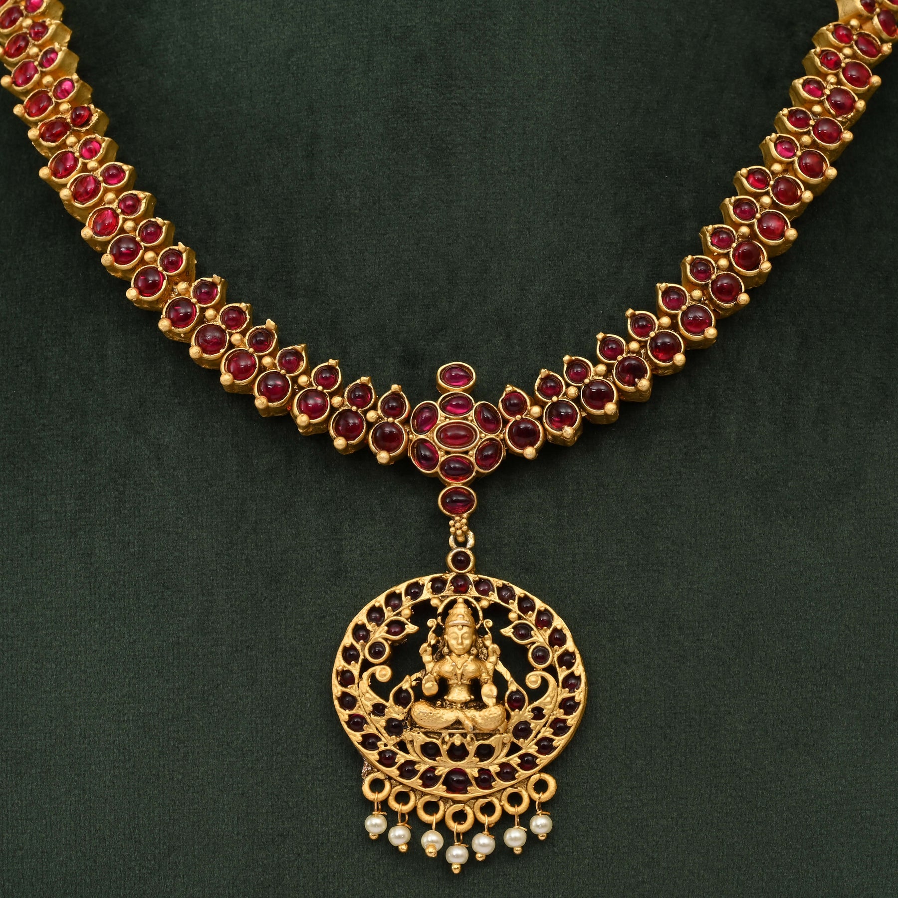 Elevate your traditional ensemble with this exquisite Temple Necklace Set, a masterpiece of authentic craftsmanship. Featuring intricate nakshi work in lustrous gold finish, this handcrafted piece showcases the divine presence of Goddess Lakshmi, symbolizing prosperity and grace. Each detail is meticulously carved by skilled artisans, making this a truly one-of-a-kind treasure. Perfect for festivals, weddings, and special occasions, this temple-inspired set captures the essence of timeless Indian heritage with its ornate design and superior artistry.