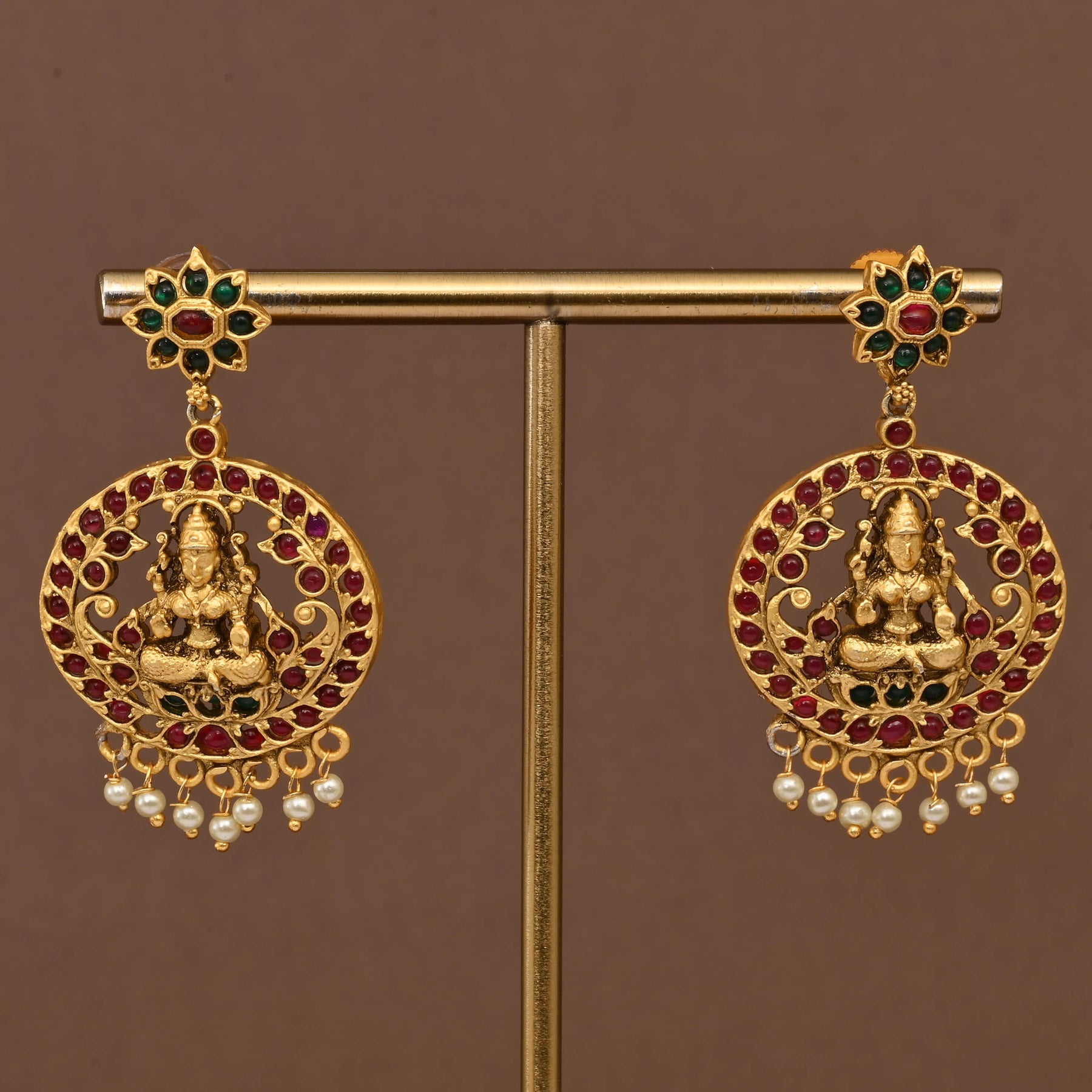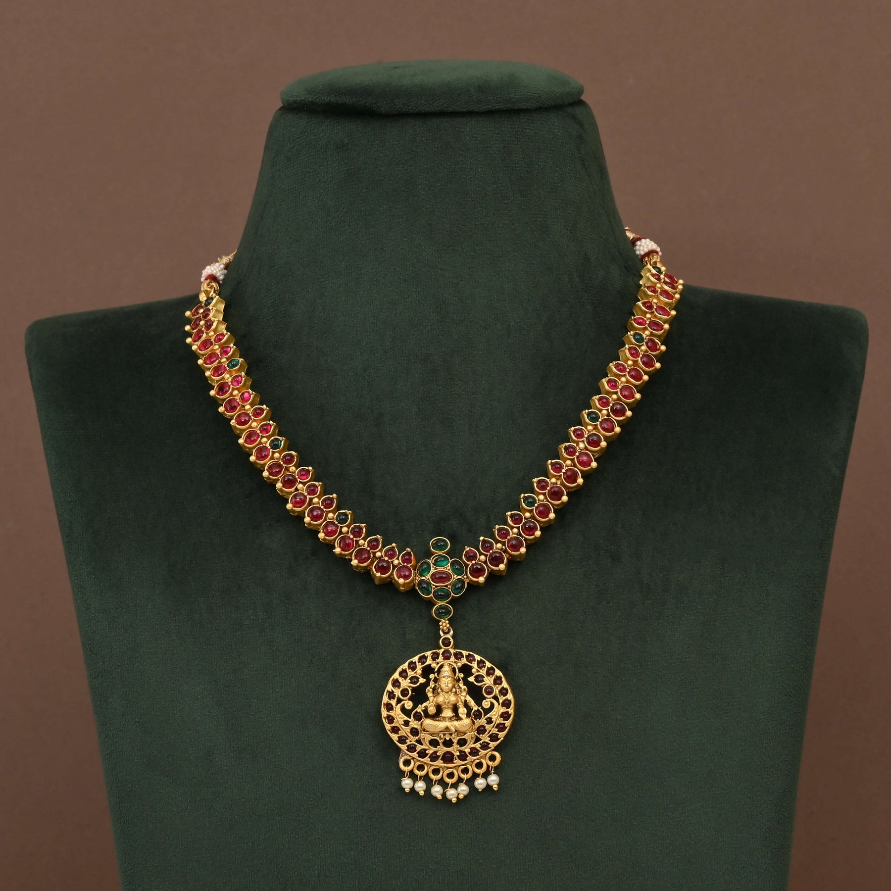 Elevate your traditional ensemble with this exquisite Temple Necklace Set, a masterpiece of handcrafted artistry. Featuring an authentic gold finish, this nakshi-style piece showcases intricate detailing inspired by Goddess Lakshmi, embodying divine grace and prosperity. Each set is meticulously crafted by skilled artisans, making it truly one of a kind. Perfect for festivals, weddings, or special occasions, this temple jewelry captures the essence of timeless Indian craftsmanship and cultural heritage.