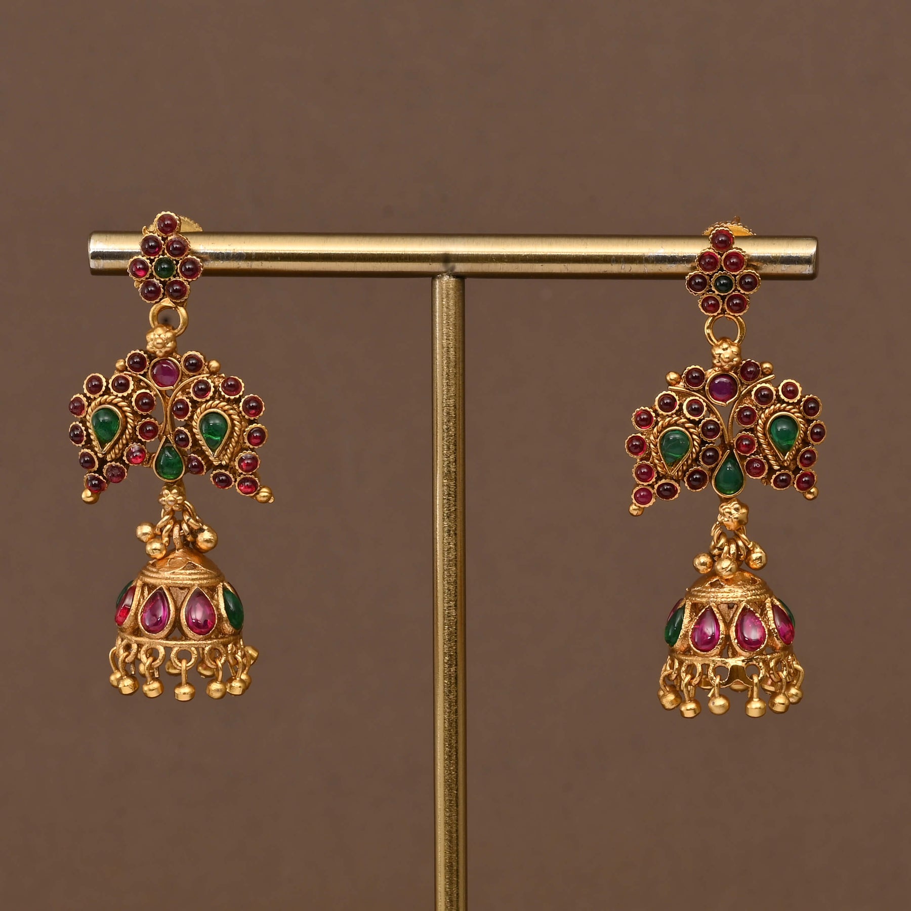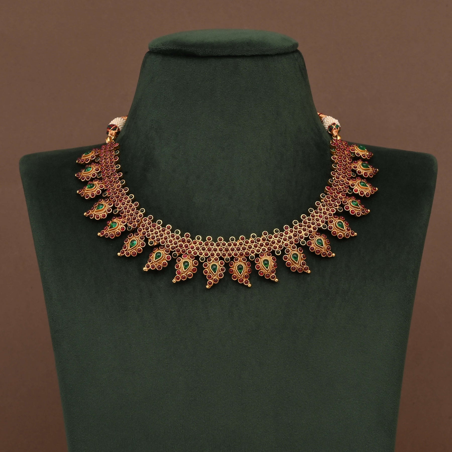 Elevate your traditional ensemble with this exquisite Temple Necklace Set, crafted in lustrous gold finish. Each piece showcases authentic nakshi artistry—intricate hand-carved detailing that reflects centuries of jewelry-making heritage. The meticulous handcrafted construction ensures every necklace is genuinely one of a kind, featuring the ornamental grandeur characteristic of temple jewelry. Perfect for festive occasions, weddings, or cultural celebrations, this set combines timeless elegance with the distinctive charm of artisanal craftsmanship.
