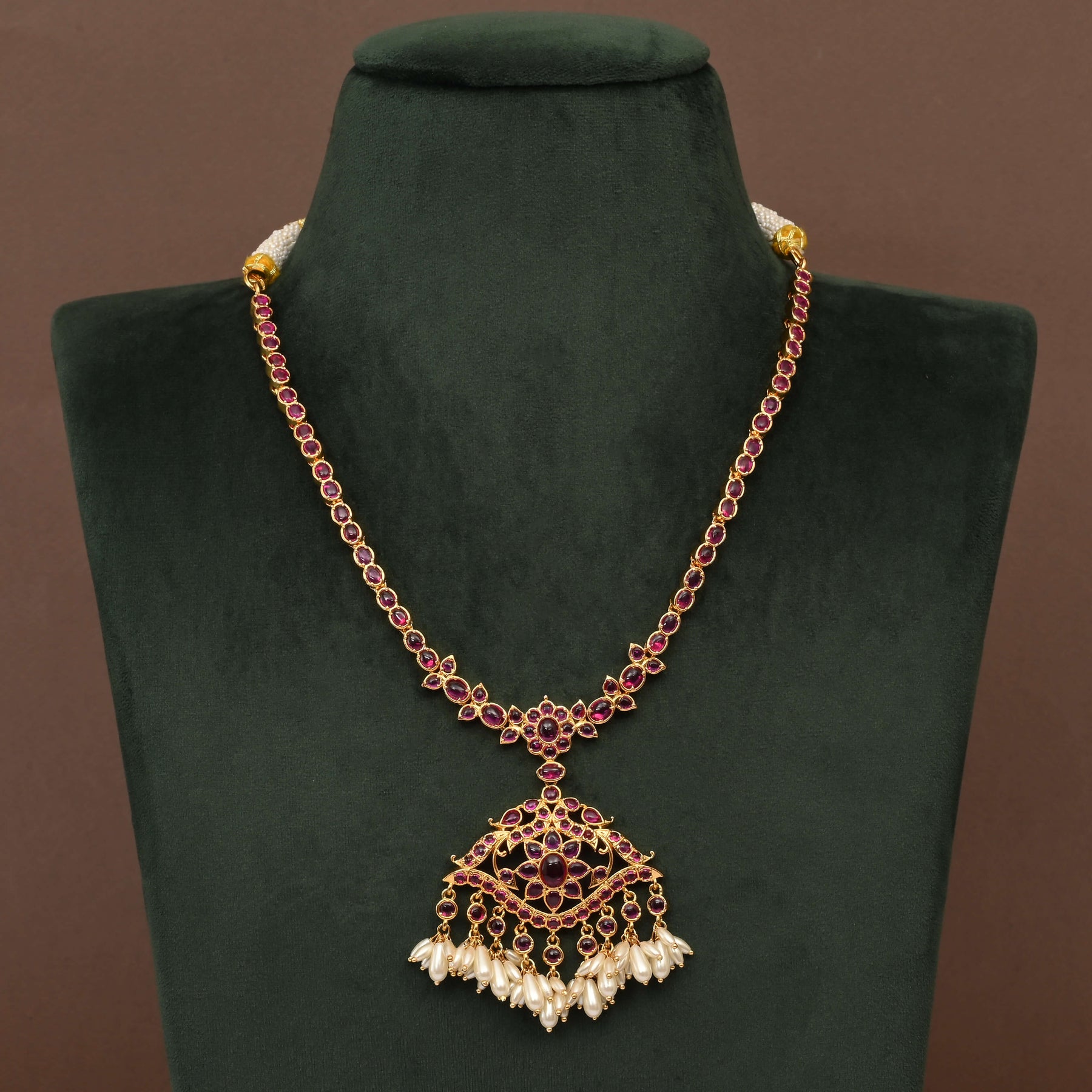 Elevate your traditional ensemble with this exquisite Temple Necklace Set, crafted in lustrous gold finish. Each piece showcases authentic nakshi artistry—intricate hand-carved detailing that reflects centuries of jewelry-making heritage. The traditional design features ornamental temple motifs, making it an ideal choice for festivals, weddings, and special occasions. Handcrafted with meticulous attention to detail, this one-of-a-kind set combines timeless elegance with artisanal craftsmanship. A statement piece that honors classical Indian jewelry aesthetics while adding sophistication to your collection.