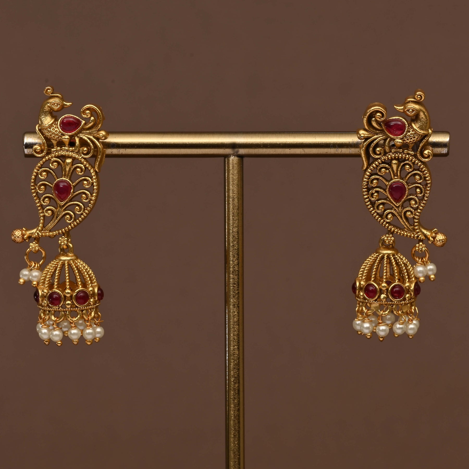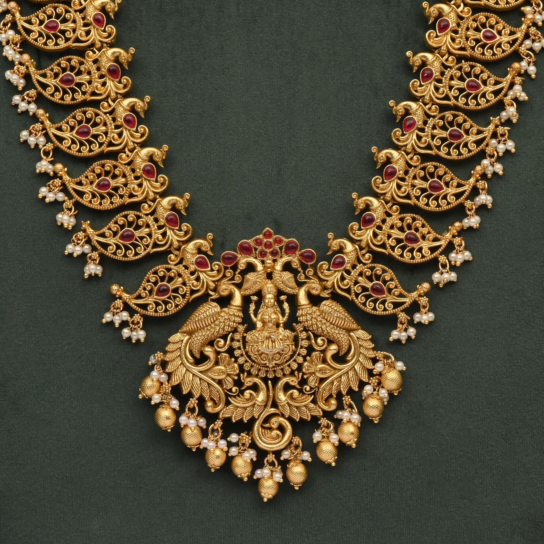 This Temple Necklace Set showcases an exclusive handcrafted design that reflects traditional artistry with the appearance of real gold. Meticulously crafted, it offers an authentic and elegant look, perfect for enhancing cultural attire or special occasions. The detailed workmanship ensures a timeless piece that combines heritage with sophistication.