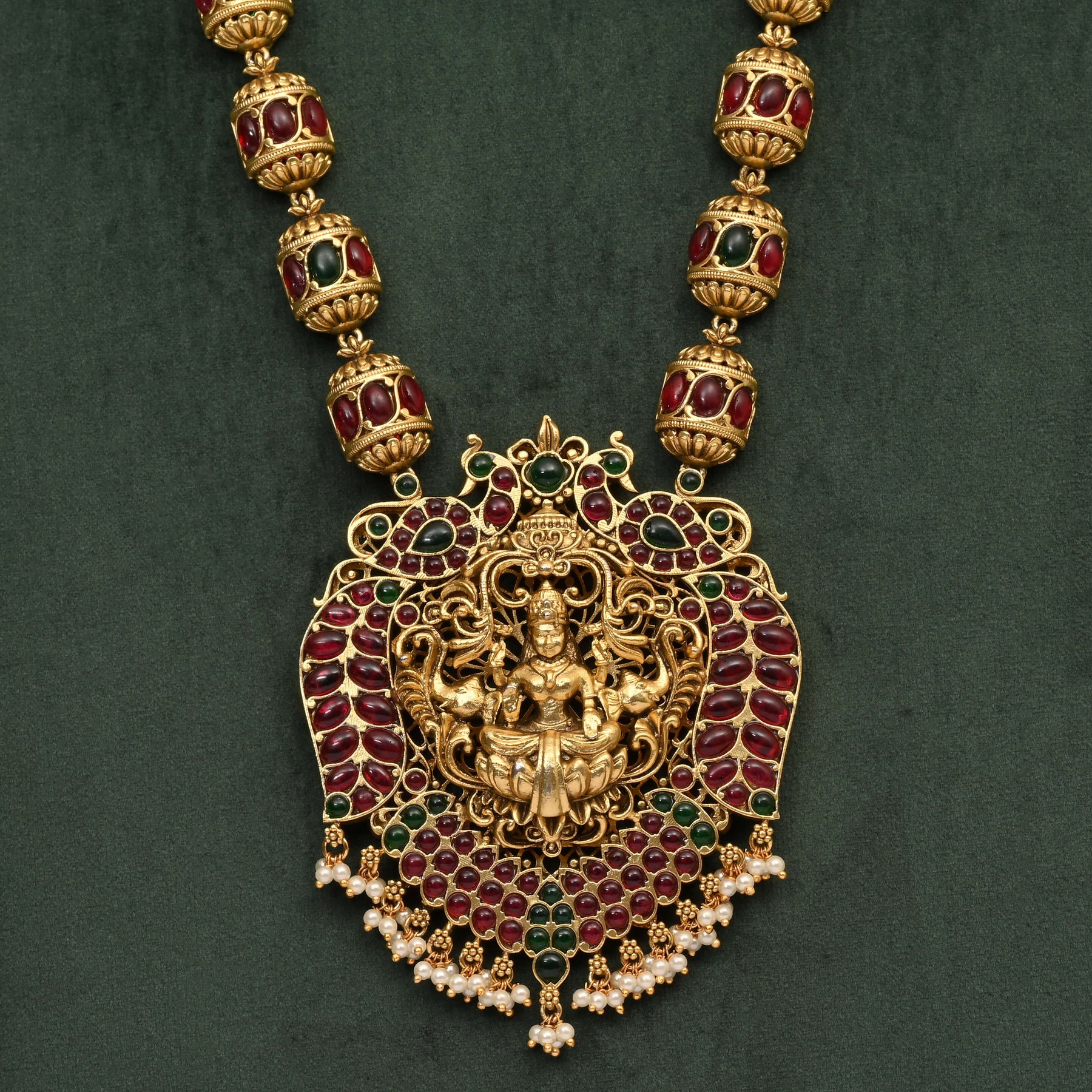 This handcrafted Temple Necklace Set showcases an exclusive design with a traditional aesthetic. Featuring semi-precious ruby and emerald stones, it offers the rich appearance of real gold in a refined finish. Perfect for those seeking timeless elegance combined with expert craftsmanship.