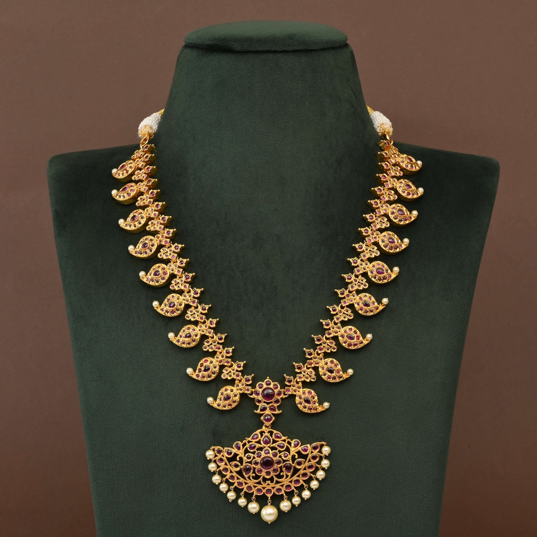Embrace timeless elegance with this exquisite Temple Necklace Set, crafted in lustrous gold finish. Inspired by traditional mango mala and nakshi design aesthetics, each piece showcases meticulous handcrafted detailing that celebrates authentic temple jewelry artistry. The intricate workmanship reflects centuries-old goldsmith techniques, making this a truly one-of-a-kind treasure. Perfect for festive occasions, religious ceremonies, or adding a touch of cultural sophistication to your everyday ensemble. A masterpiece that honors heritage while making a distinctive statement.