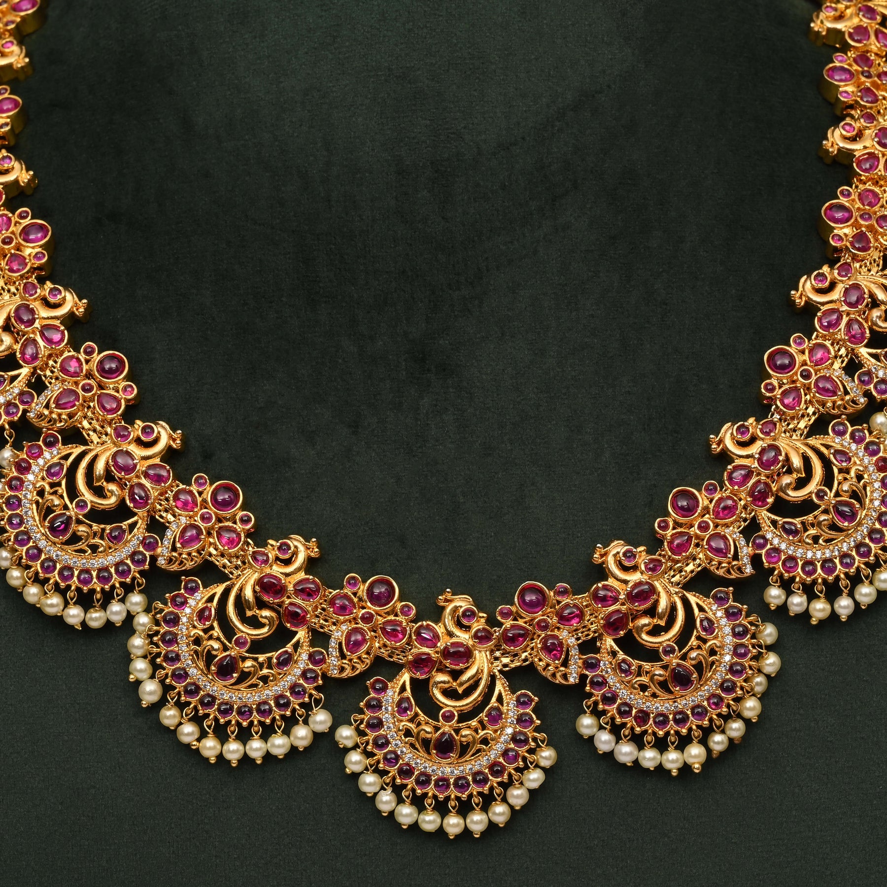 Elevate your traditional ensemble with this exquisite Temple Necklace Set, a masterpiece of handcrafted artistry. Featuring authentic chandbali-inspired design elements and intricate nakshi work, this gold-finish piece captures the essence of temple jewelry with timeless elegance. Each set is meticulously crafted by skilled artisans, making it truly one of a kind. The lustrous gold look complements both festive occasions and everyday wear, while the traditional design ensures it remains a cherished heirloom for generations. Perfect for those who appreciate authentic craftsmanship and cultural heritage.