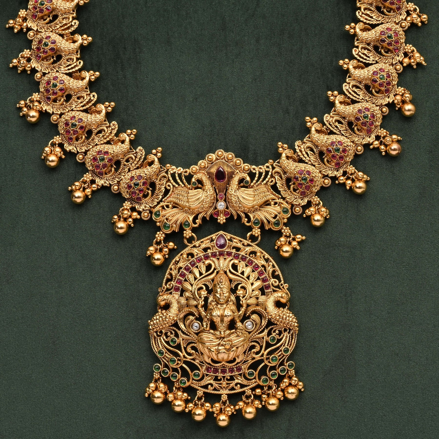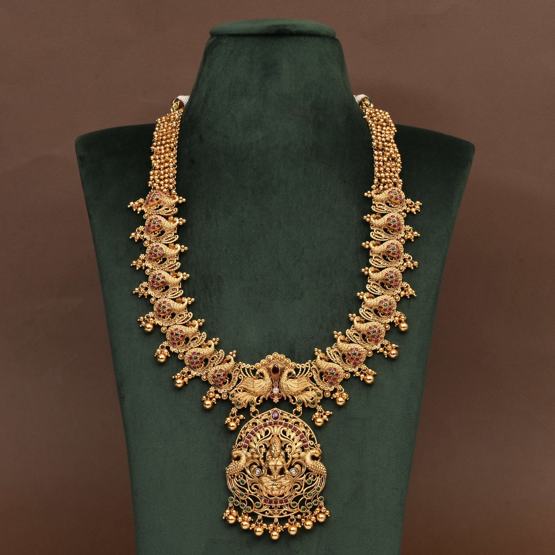 Elevate your traditional attire with this handcrafted Temple Necklace Set, featuring an exclusive goddess Lakshmi design. Finished in a rich gold tone that closely resembles real gold, this set combines timeless craftsmanship with authentic style, perfect for festive and ceremonial occasions. Its intricate detailing reflects expert artistry, making it a distinguished choice for those seeking refined elegance rooted in heritage.