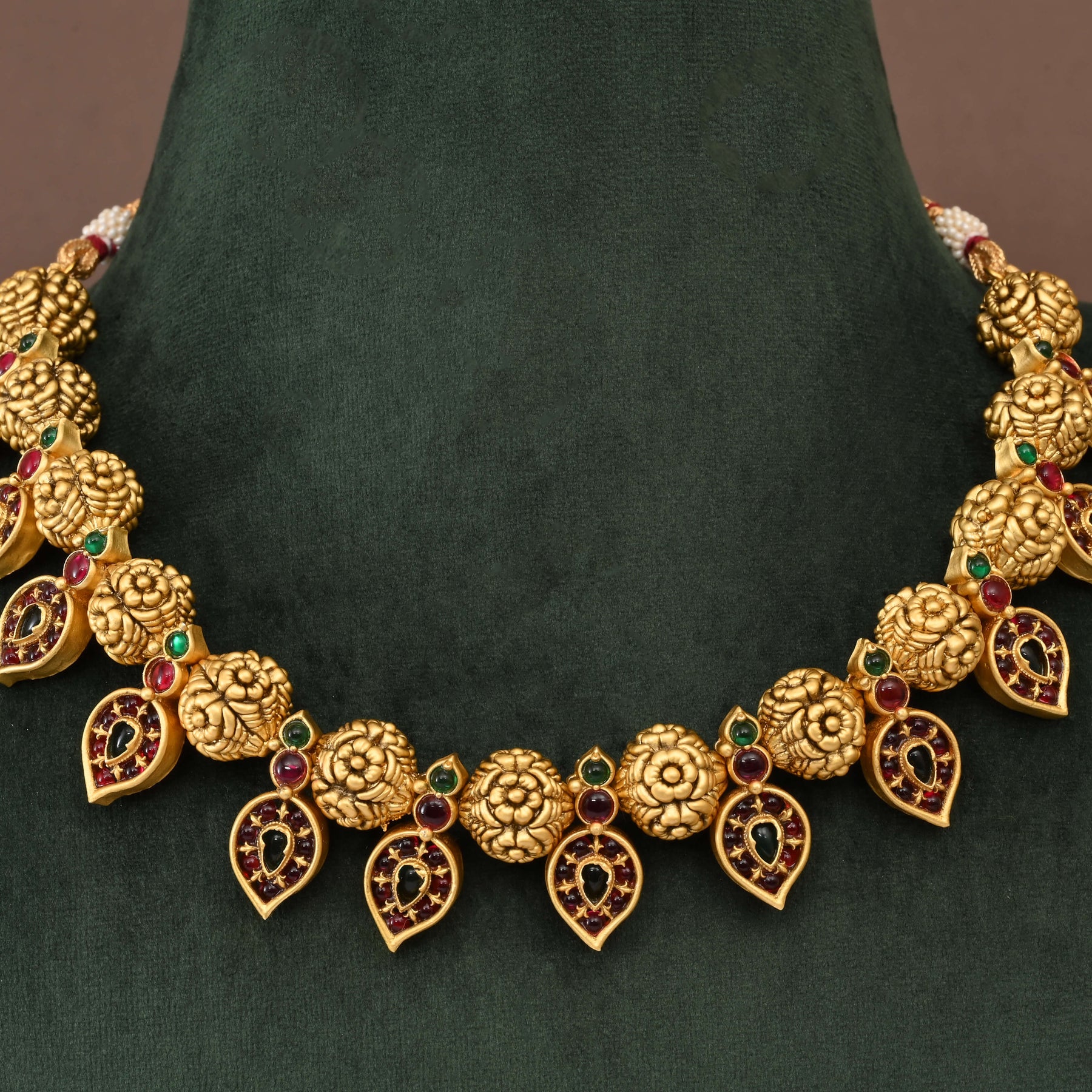 Elevate your traditional ensemble with this exquisite Temple Necklace Set, crafted in lustrous gold finish. Each piece showcases authentic nakshi artistry—intricate hand-carved detailing that reflects centuries of jewelry-making heritage. The meticulous handcrafted construction ensures every necklace is genuinely one of a kind, featuring the ornamental grandeur characteristic of temple jewelry. Perfect for festive occasions, weddings, or cultural celebrations, this set combines timeless elegance with the distinctive charm of artisanal craftsmanship.