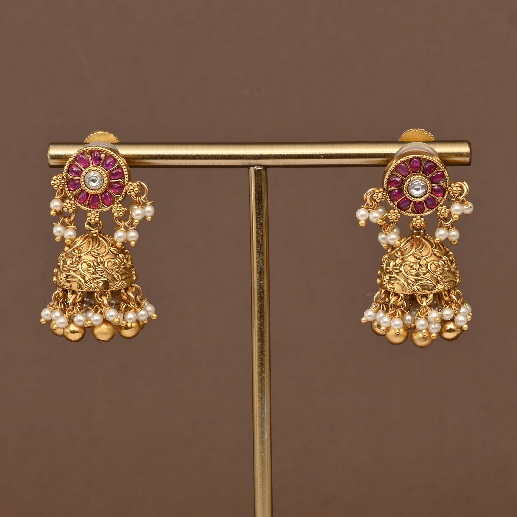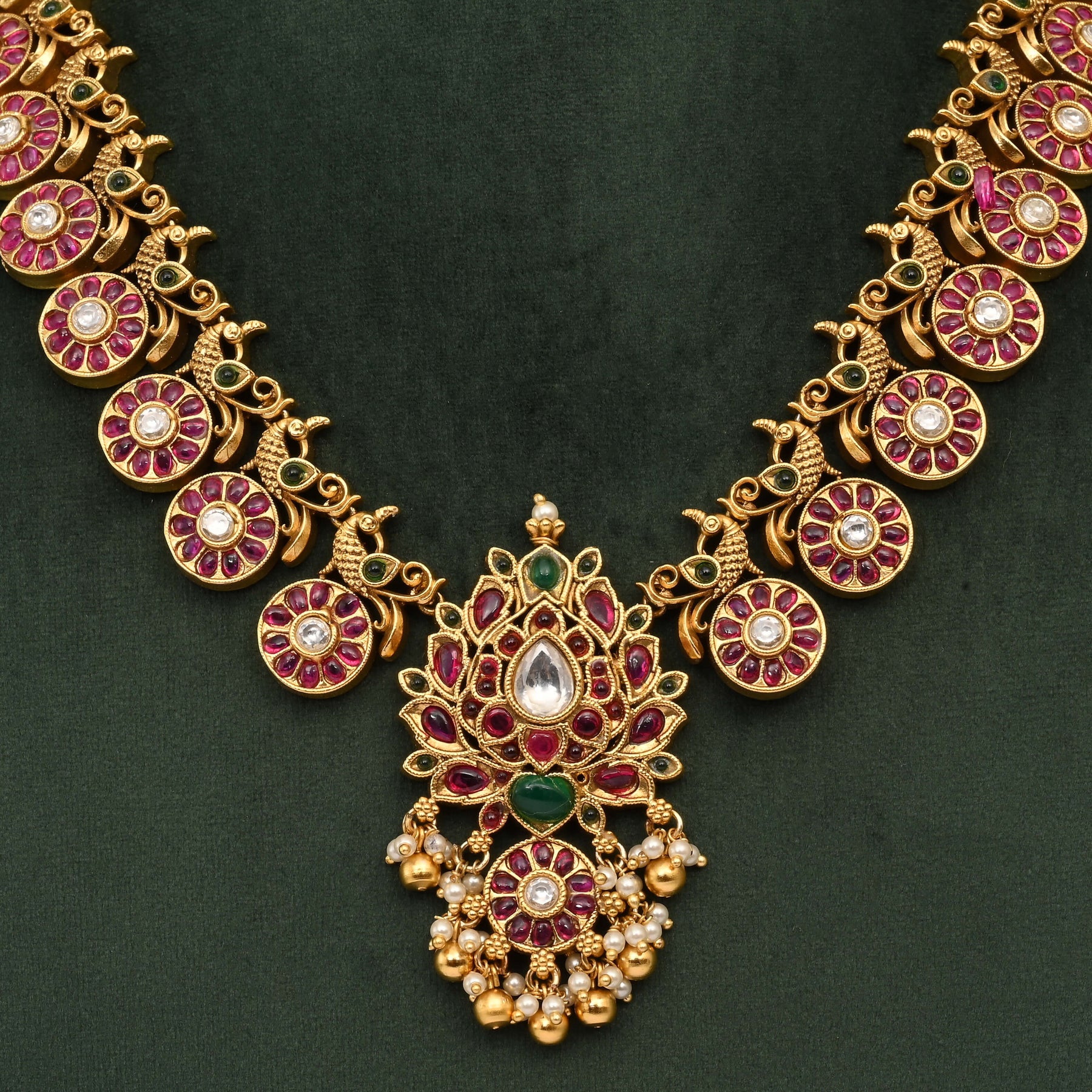 Elevate your traditional wardrobe with this exquisite Temple Necklace Set, crafted in a lustrous gold finish that captures timeless elegance. Each piece showcases authentic nakshi artistry—intricate hand-carved detailing that reflects centuries of jewelry-making heritage. Meticulously handcrafted by skilled artisans, this one-of-a-kind set combines classical temple design with contemporary appeal. Perfect for festive occasions, weddings, or adding a touch of cultural sophistication to your everyday style. A treasured investment piece that celebrates the artistry of traditional Indian jewelry.