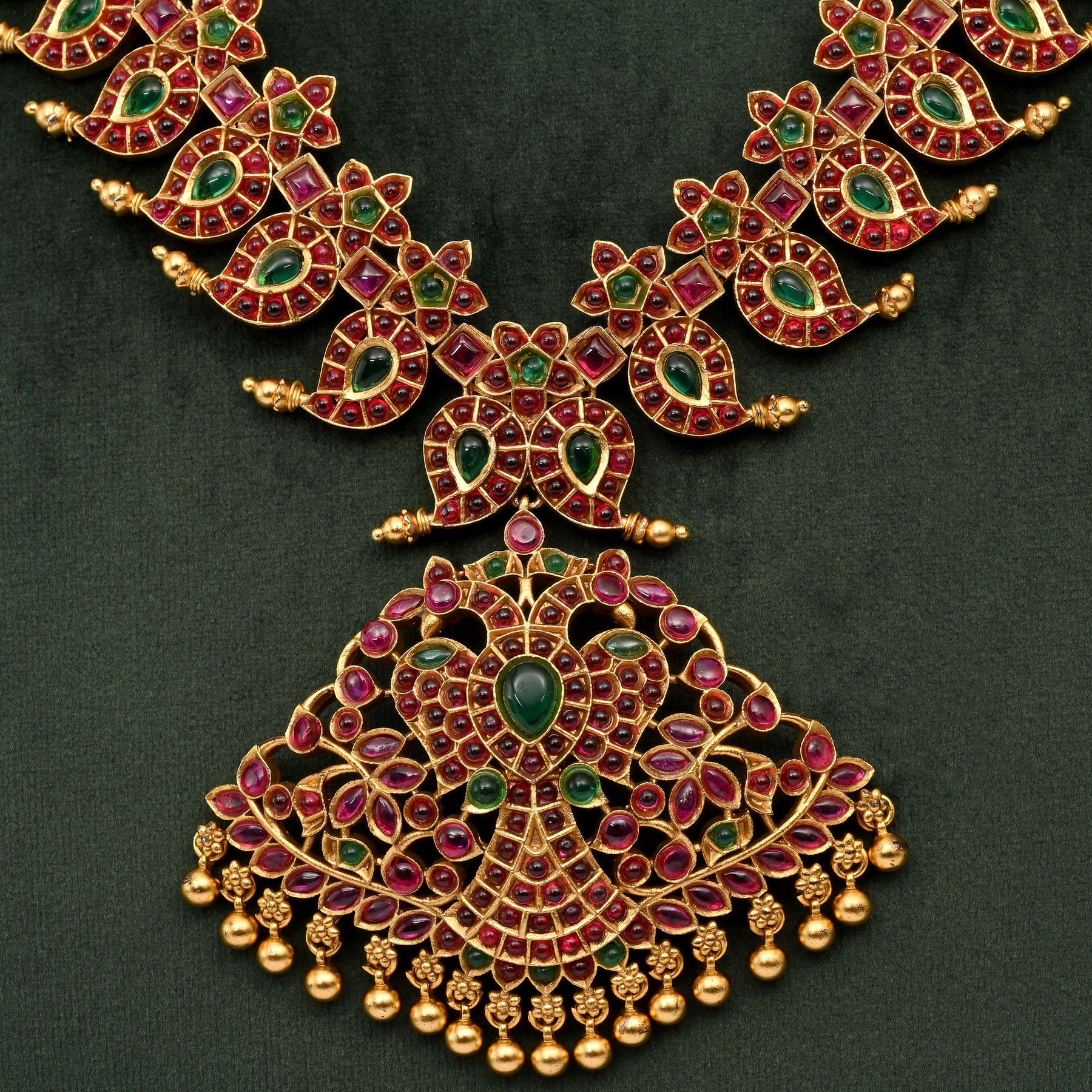 Elevate your traditional ensemble with this exquisite Temple Necklace Set, crafted in lustrous gold finish. Each piece showcases authentic nakshi artistry—intricate hand-carved detailing that reflects centuries of jewelry-making heritage. The ornate temple design features traditional motifs, making it a distinctive statement piece perfect for festivals, weddings, and special occasions. Handcrafted with meticulous attention to detail, this one-of-a-kind set combines timeless elegance with artisanal craftsmanship. A treasured addition to any jewelry collection that celebrates cultural artistry and refined taste.